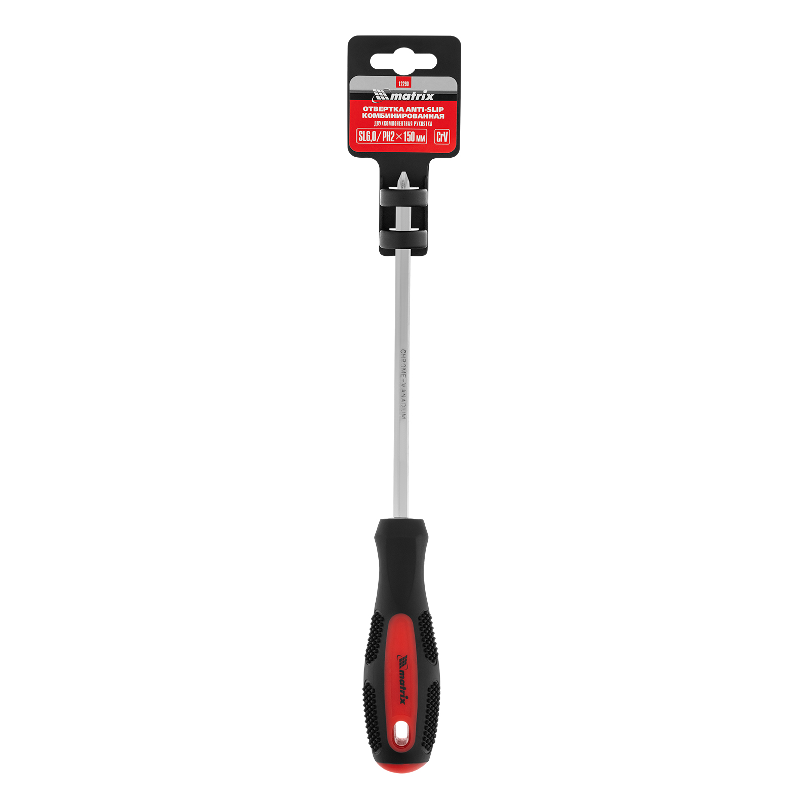 Комбинированная отвертка Matrix 12290, SL6,0 / PH2 мм, из стали CrV, с антискользящей двухкомпонентной рукояткой, за счет двухстороннего стержня позволяет производить монтаж/демонтаж резьбовых соединений сразу двух типов: Slotted и Phillips. Она станет незаменимым инструментом для строителей, монтажников, слесарей и частных мастеров. Благодаря длине стержня 150 мм отвертка легко достает до крепежа в углублениях.