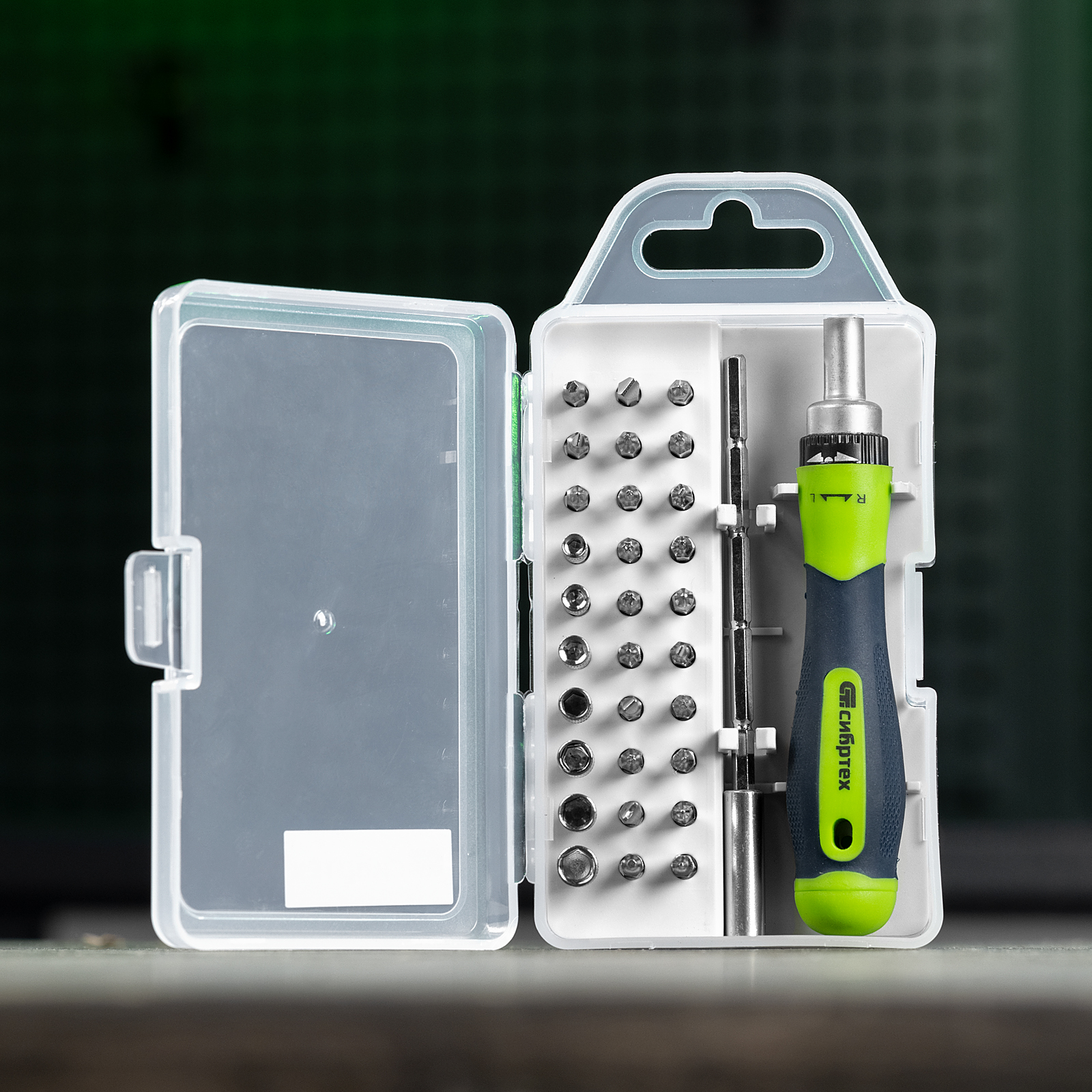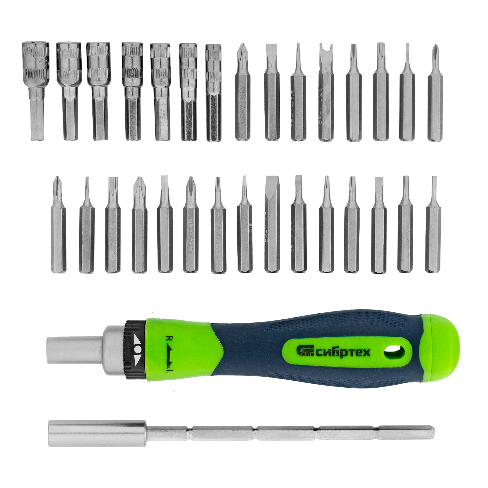 Реверсивная отвертка с набором бит и торцевых головок Сибртех 13370, 32 предмета из стали CrV, используется для точных работ с мелкими резьбовыми соединениями. Она пригодится для бытового использования и решения несложных профессиональных задач по ремонту электроники, игрушек и пр. Удлинитель в комплекте позволяет осуществлять монтаж/демонтаж крепежа в труднодоступных местах.
