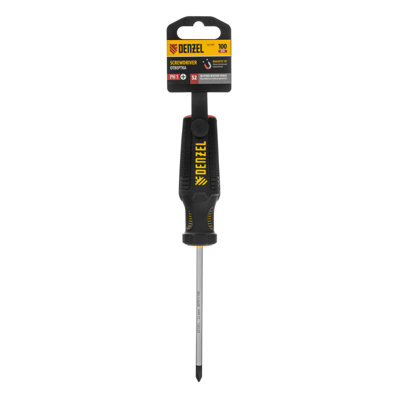 Отвертка Denzel 121747 с трехкомпонентной рукояткой, со стержнем из стали S2, длиной 100 мм, предназначена для закручивания и откручивания резьбового крепежа типа PH1. Высокоточный намагниченный шлиц избавляет мастера от необходимости придерживать винт или саморез рукой. Отвертка рекомендована для профессионального использования.