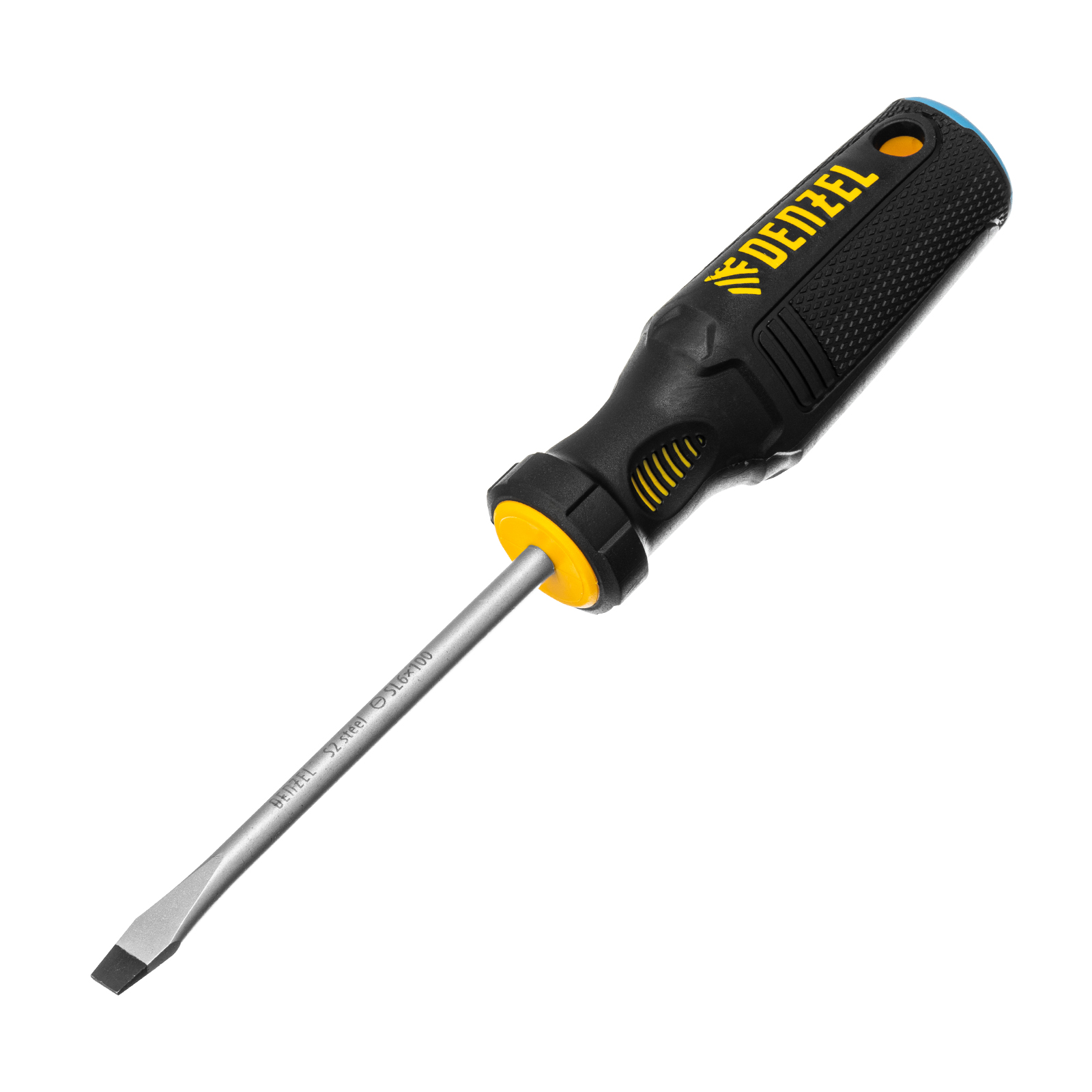 Отвертка Denzel 121987 с трехкомпонентной рукояткой, со стержнем из стали S2, длиной 100 мм, предназначена для монтажа и демонтажа винтов и саморезов с прямым шлицем SL6. Высокоточный намагниченный шлиц крепко фиксируется в головке крепежа. Отвертка выдерживает интенсивное применение, предназначена для выполнения профессиональных ремонтных и монтажных работ.