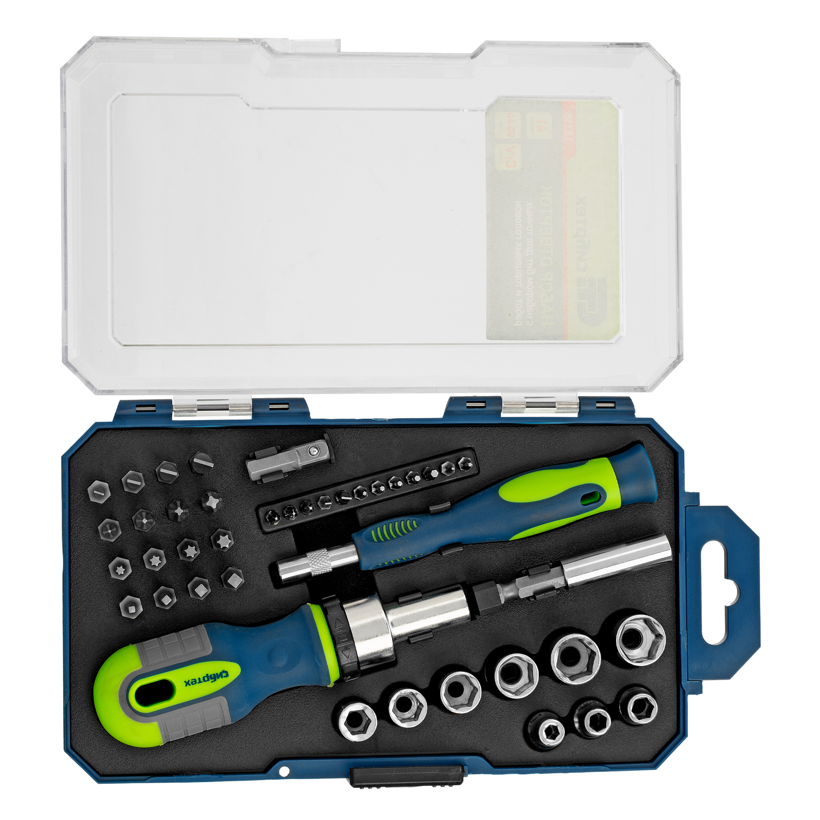 Отвертка реверсивная для бит 1/4" - 1 штОтвертка для точных работ - 1 штУдлинитель 1/4" - 1 штПереходник для торцевых головок 1/4" - 1 штТорцевые головки: 4, 5, 6, 7, 8, 9, 10, 11, 12 мм - 9 штБиты 1/4": SL3, SL4, SL5, SL6, PH0, PH1, PH2, PH3 - 8 шт Биты 1/4": Т10, Т15, Т20, Т25, S0, S1, S2, S3 - 8 штБиты для точных работ: SL2, SL3, Т5, Т6 - 2 шт Биты для точных работ: PH000, PH00, PH0 - 3 шт Биты для точных работ: Pb 0.8, 1.2 - 2 штБиты для точных работ: H1.3, Н1.5, Н2.0 - 3 шт |