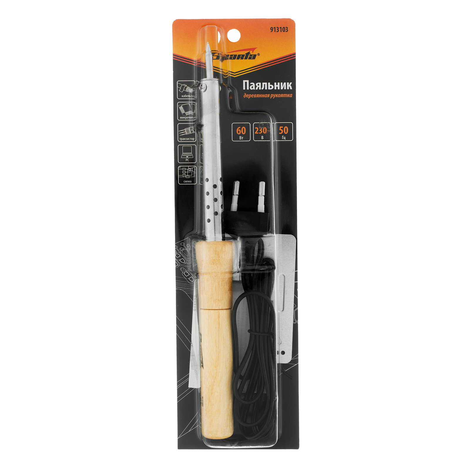 Паяльник Sparta 913103 мощностью 60 Вт, с ручкой из дерева, питается от сети 220 В и используется для пайки электропроводки, микрочипов, электрических схем и транзисторов. Нагревательным элементом является нихромовая спираль, что уменьшает вероятность поломки прибора в результате падения или удара. Конусовидный наконечник позволяет успешно решать поставленные задачи. Защитное покрытие улучшает прилипание припоя и защищает наконечник от коррозии. Паяльник пригодится для ремонта электроники, бытовой техники, а также обслуживания автомобилей и проведения электромонтажных работ.