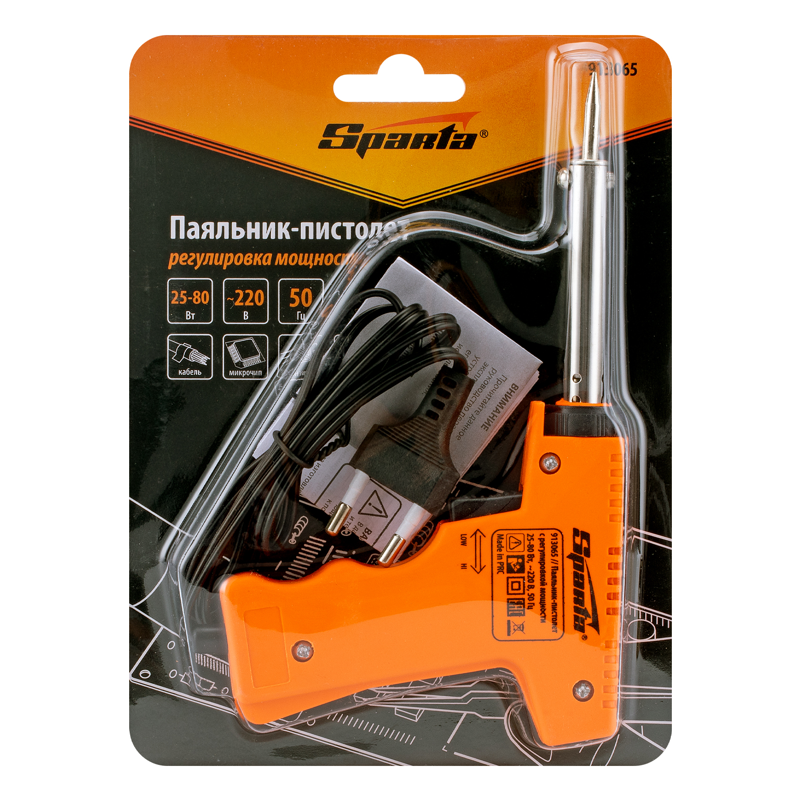 Паяльник-пистолет Sparta 913065 с регулировкой мощности в диапазоне 25-80 Вт питается от сети 220 В и предназначен для пайки микрочипов, транзисторов, электросхем, кабелей. Благодаря керамическому нагревательному элементу подходит для длительной непрерывной работы. Съемное жало может быть заменено в случае необходимости. Температура нагрева регулируется нажатием кнопки на рукоятке. Простой в применении прибор пригодится электромонтерам, радиолюбителям, автоэлектрикам, а также будет полезен в быту.