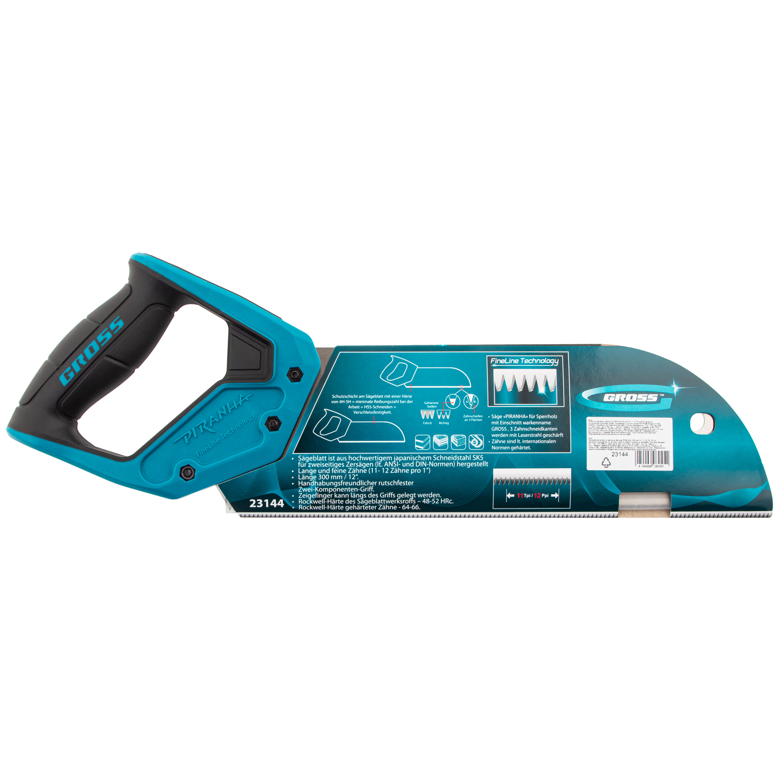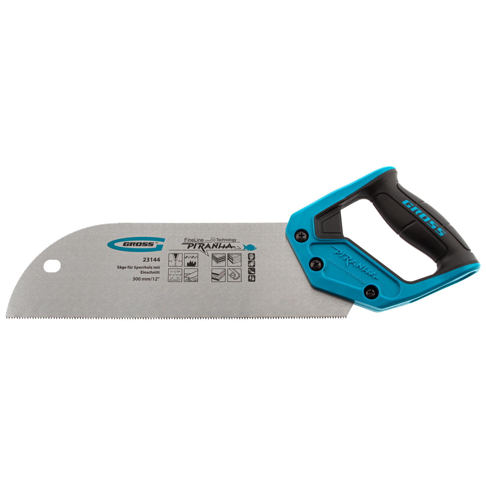 Пила для фанеры с запилом Gross PIRANHA 23144 с полотном размером 300 мм / 12", с калеными зубьями с шагом 11-12 TPI и 3D-заточкой, используется для распиловки древесины, фанеры, ДВП и ПВХ в продольном и поперечном направлении. Характеризуется высокой производительностью. Рабочая кромка с мелкими зубьями выполняет ровный гладкий рез. Запил в передней части полотна облегчает работу с заготовками. Пила будет полезна в столярной мастерской.