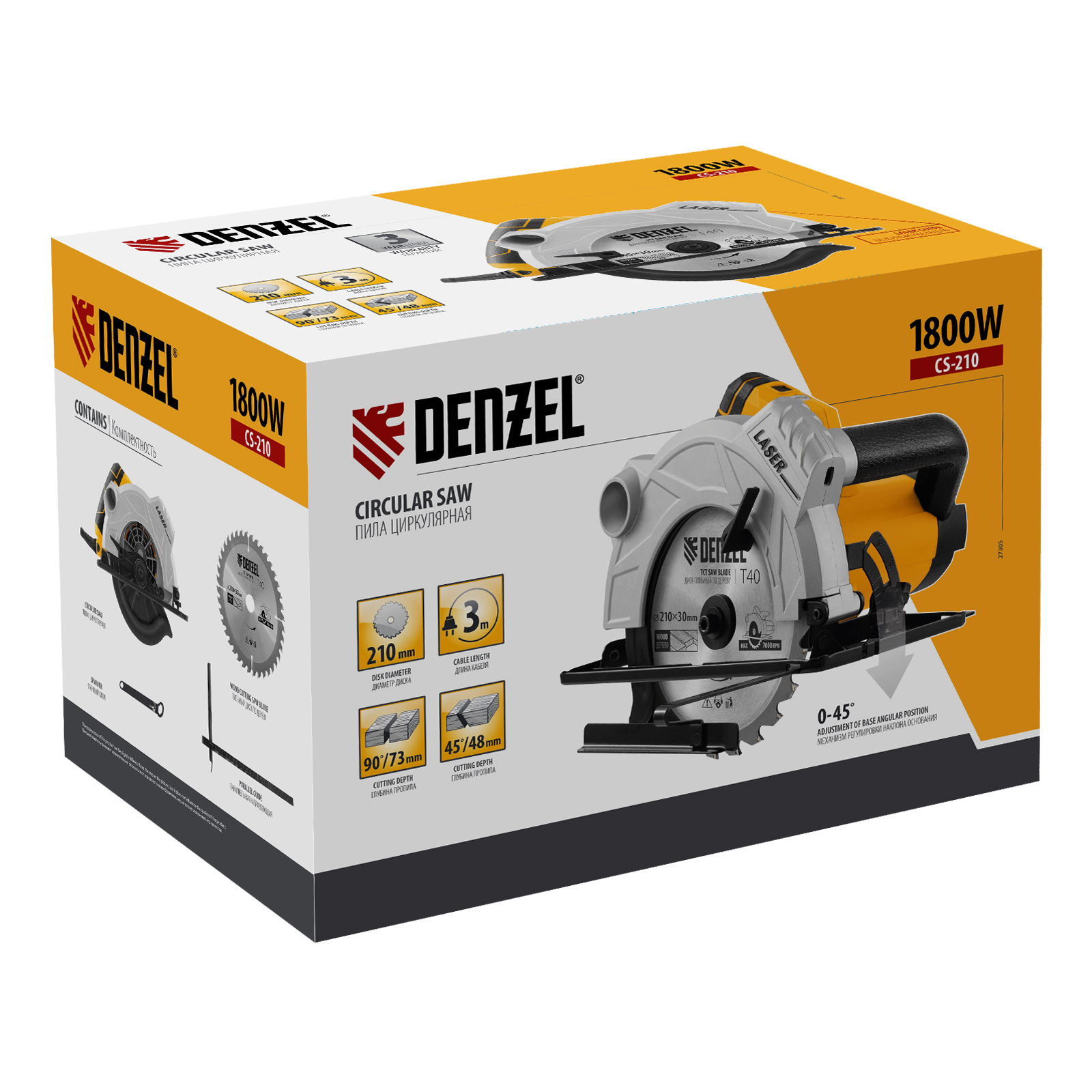 Циркулярная пила Denzel CS-210 27305 — мощная и производительная, имеет максимальную глубину реза в линейке Denzel CS — 73 мм, что обеспечивает эффективную работу с досками, фанерой, ДСП и другими листовыми древесными материалами.,Справляться с поставленными задачами помогают коллекторный двигатель мощностью 1,8 кВт, который обеспечивает частоту вращения 5000 об/мин, и пильный диск 210 х 3 мм. Глубина пропила регулируется до 73 мм, что позволяет работать с материалами разной толщины.
