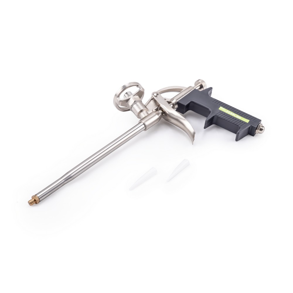 Пистолет для монтажной пены FerrLine FM-5. Предназначен для проведения работ с профессиональной монтажной пеной при установке дверей, окон, различных строительных конструкций. Прочная и крепкая металлическая конструкция гарантирует эксплуатационную надежность и долговечность, а удобная и эргономичная рукоятка снижает усилие и нагрузку при нажатии в ходе выполнения работы. Винт регулировки подачи пены обеспечивает более точное и аккуратное нанесение.