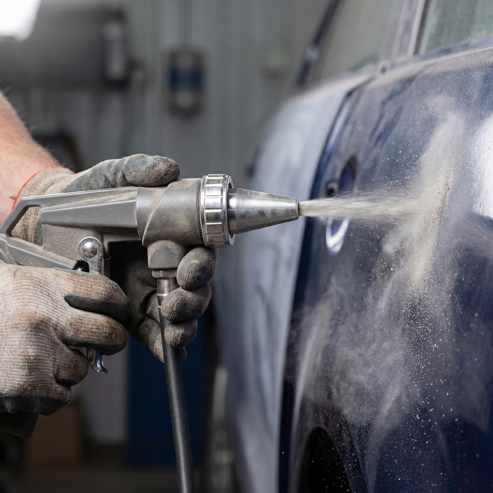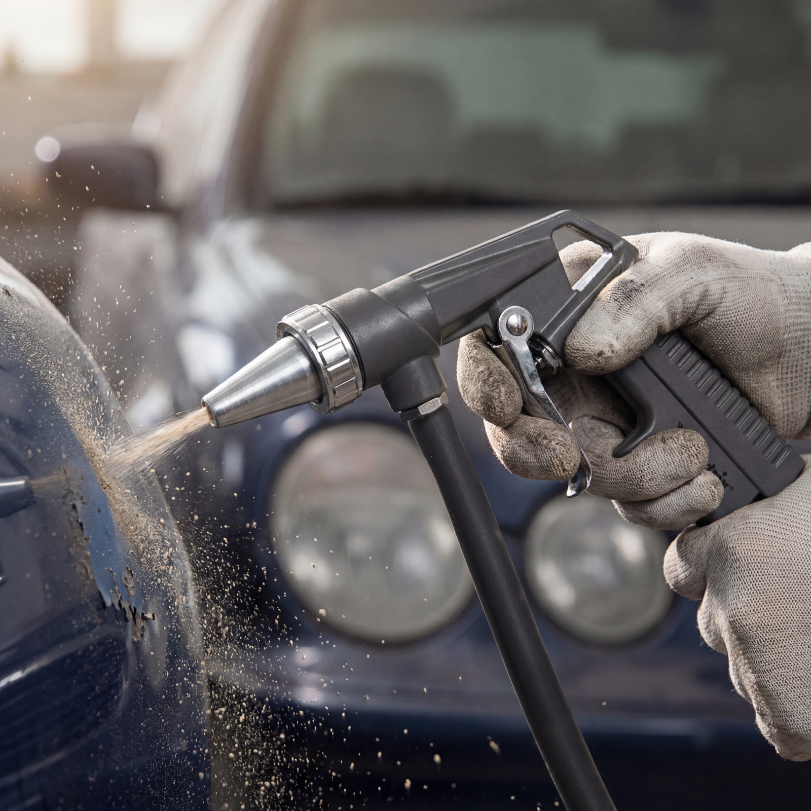 - Обработка поверхностей большой площади — абразив подается из отдельной емкости.