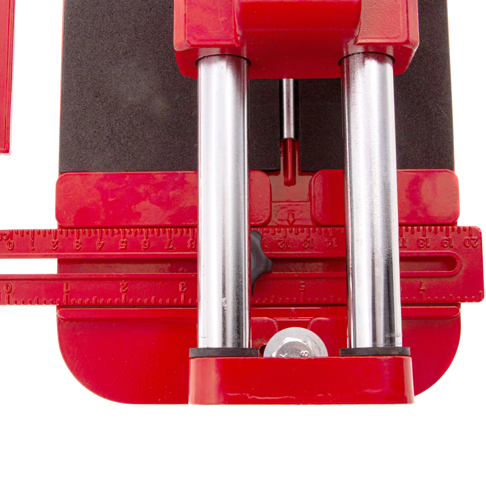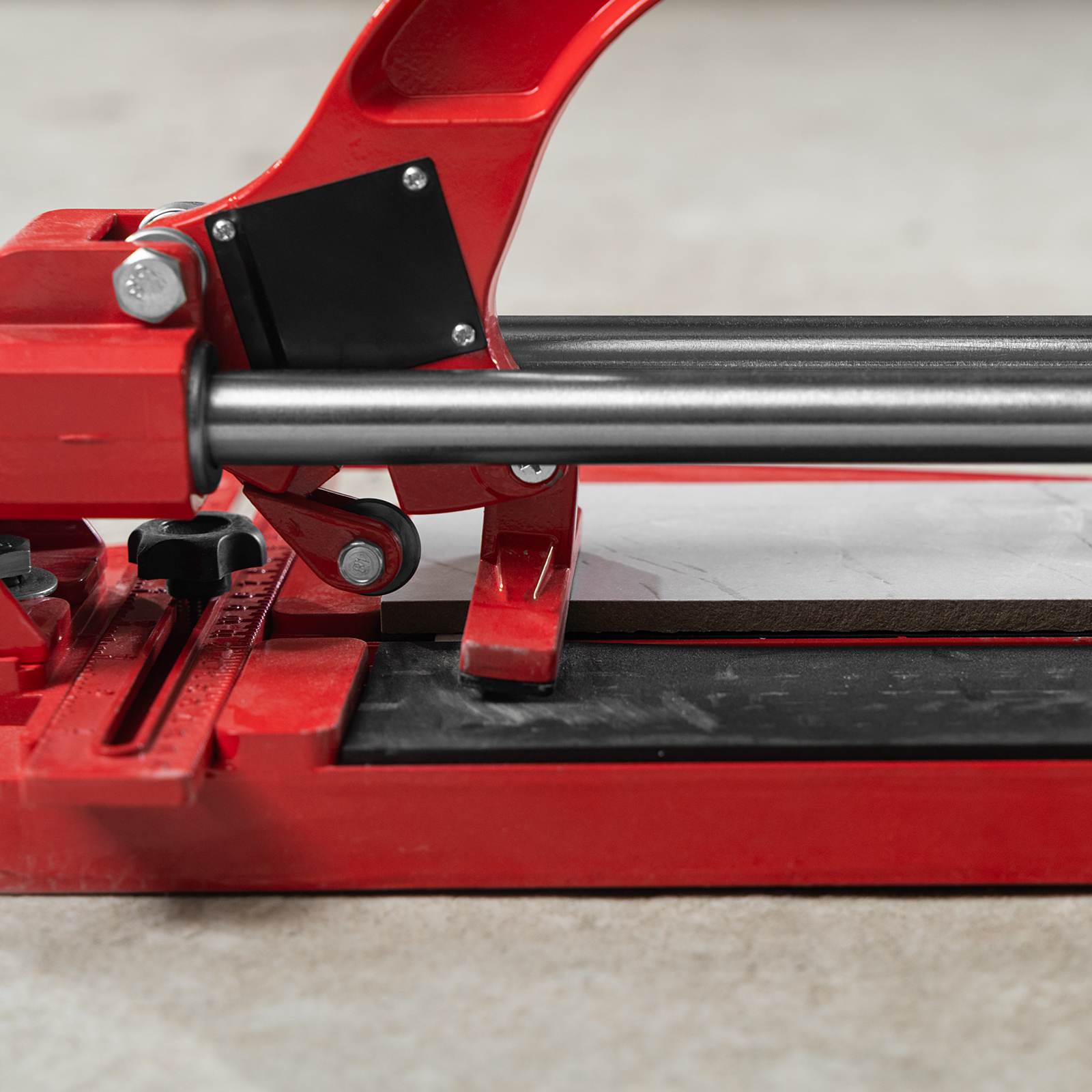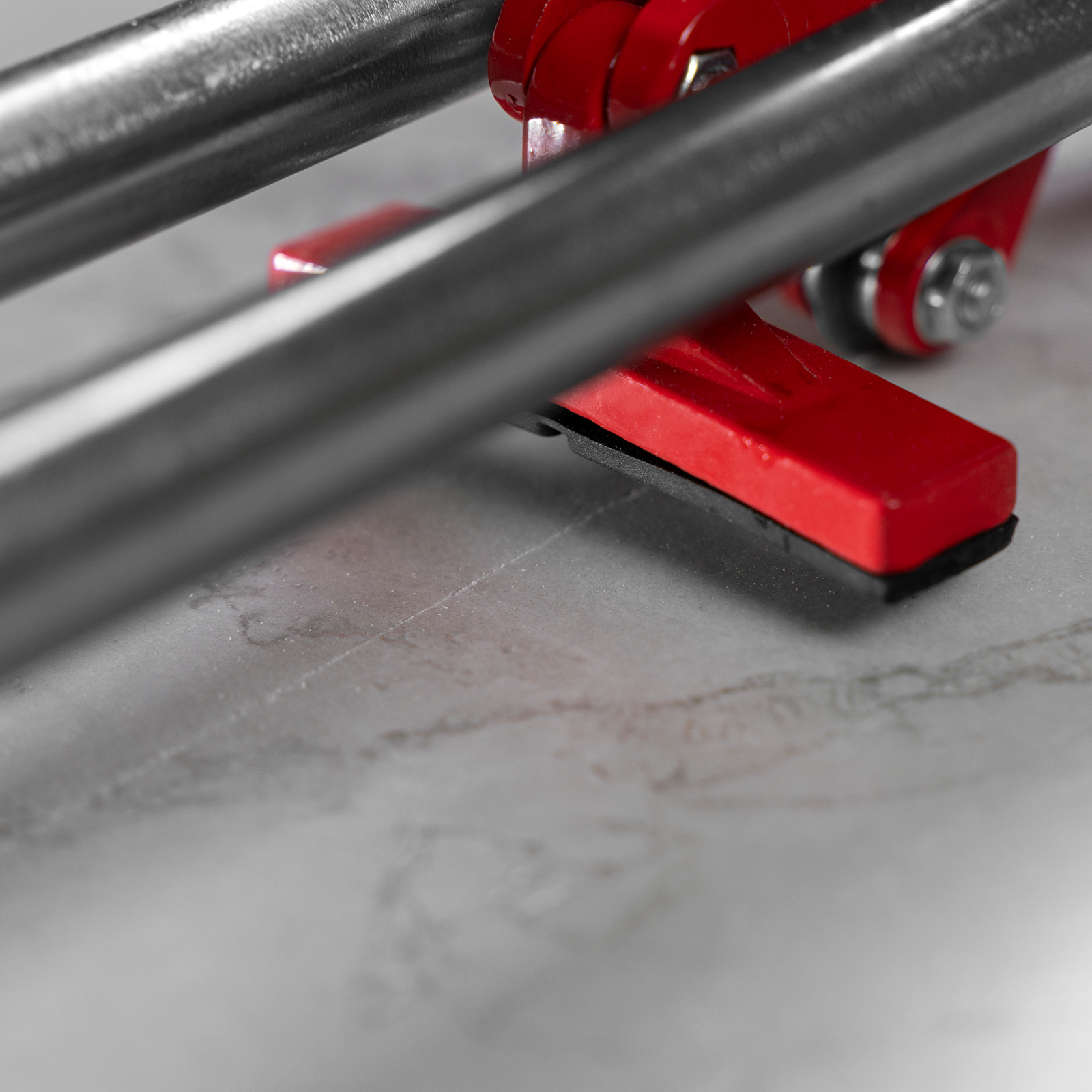 - Устойчивое основание и неподвижность плитки — плиткорез снабжен цельнолитой станиной из алюминиево-магниевого сплава с обрезиненной поверхностью, а также мягкими амортизирующими накладками.