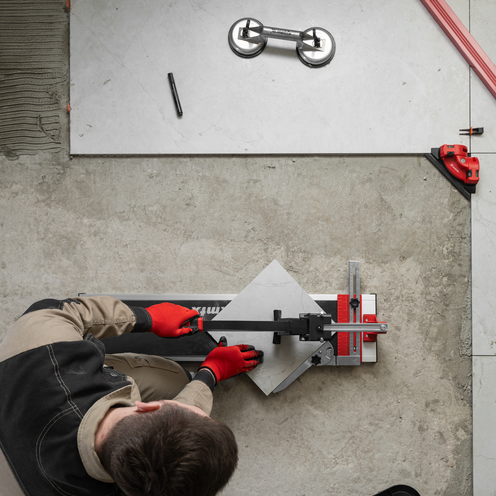- Резка под углом до 45° — производителем предусмотрен поворотный угольник-угломер, обеспечивающий также дополнительную фиксацию плитки.