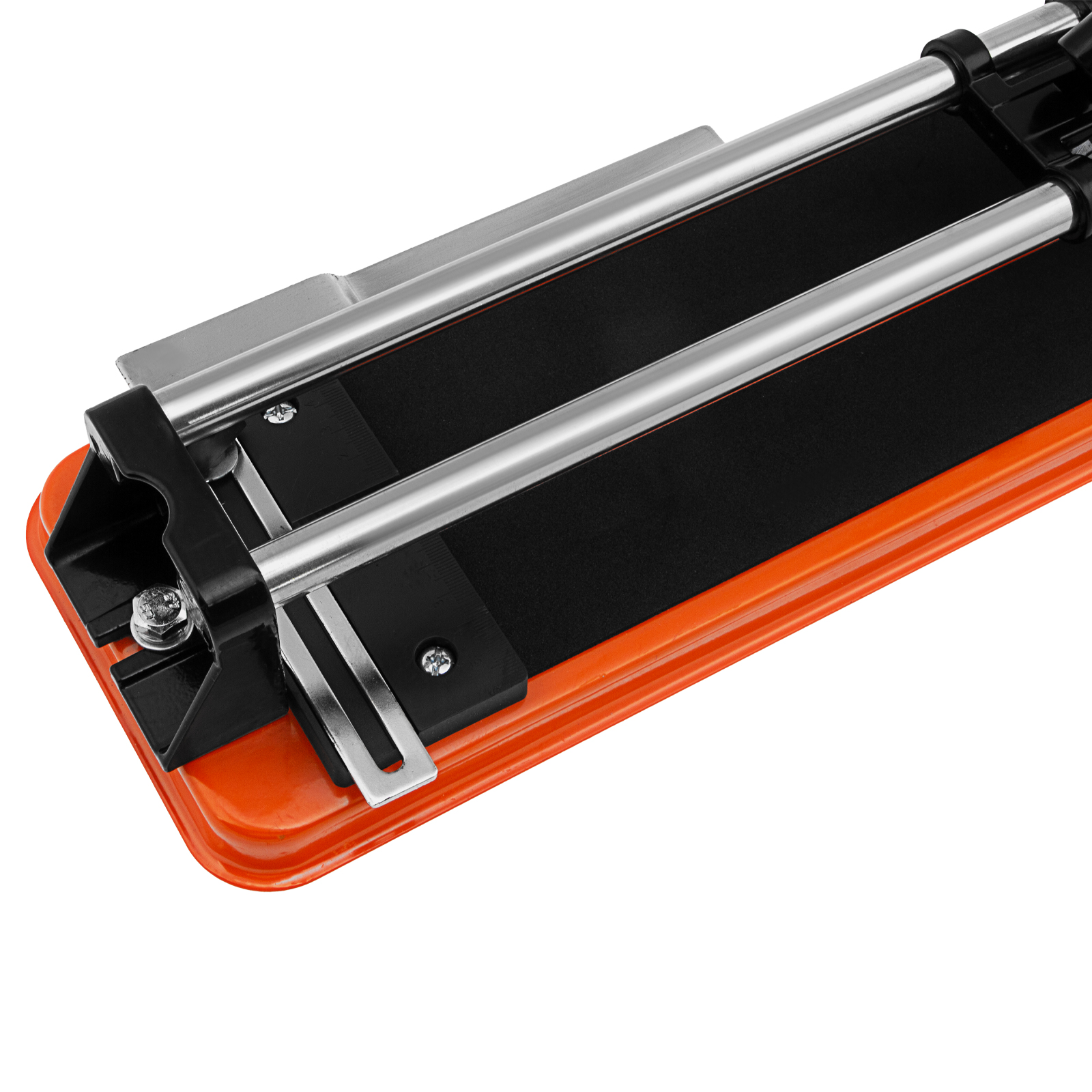 - Точность выполняемых работ — металлическая линейка-угольник облегчает позиционирование плитки на станине, твердосплавный режущий ролик обеспечивает аккуратный рез.