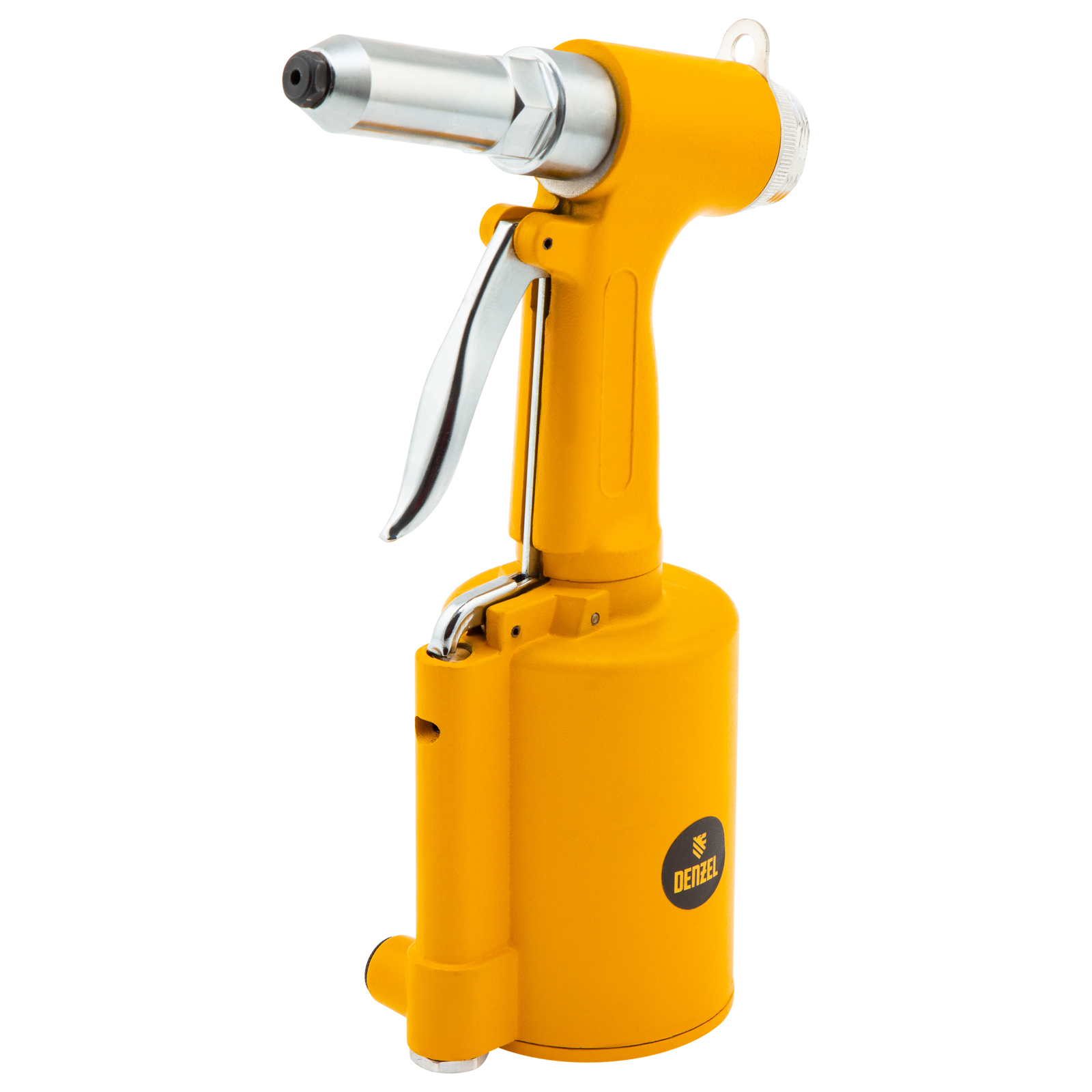 Пневматический заклепочник Denzel PR4 57479 значительно упрощает работу в автосервисах, домашних мастерских, на малых предприятиях и на ремонтных площадках. С его помощью можно без усилий скрепить листовой, профильный и панельный материал из пластика и металла.,Пистолет для вытяжных заклепок работает под давлением 6,3 АТМ и расходует всего 85 литров воздуха в минуту, поэтому для него подойдет компрессор средней мощности. В качестве оснастки используются заклепки размером 2,4-4,8 мм. В комплект поставки входит 4 насадки под заклепки размерами 2,4 мм, 3,2 мм, 4 мм и 4,8 мм.