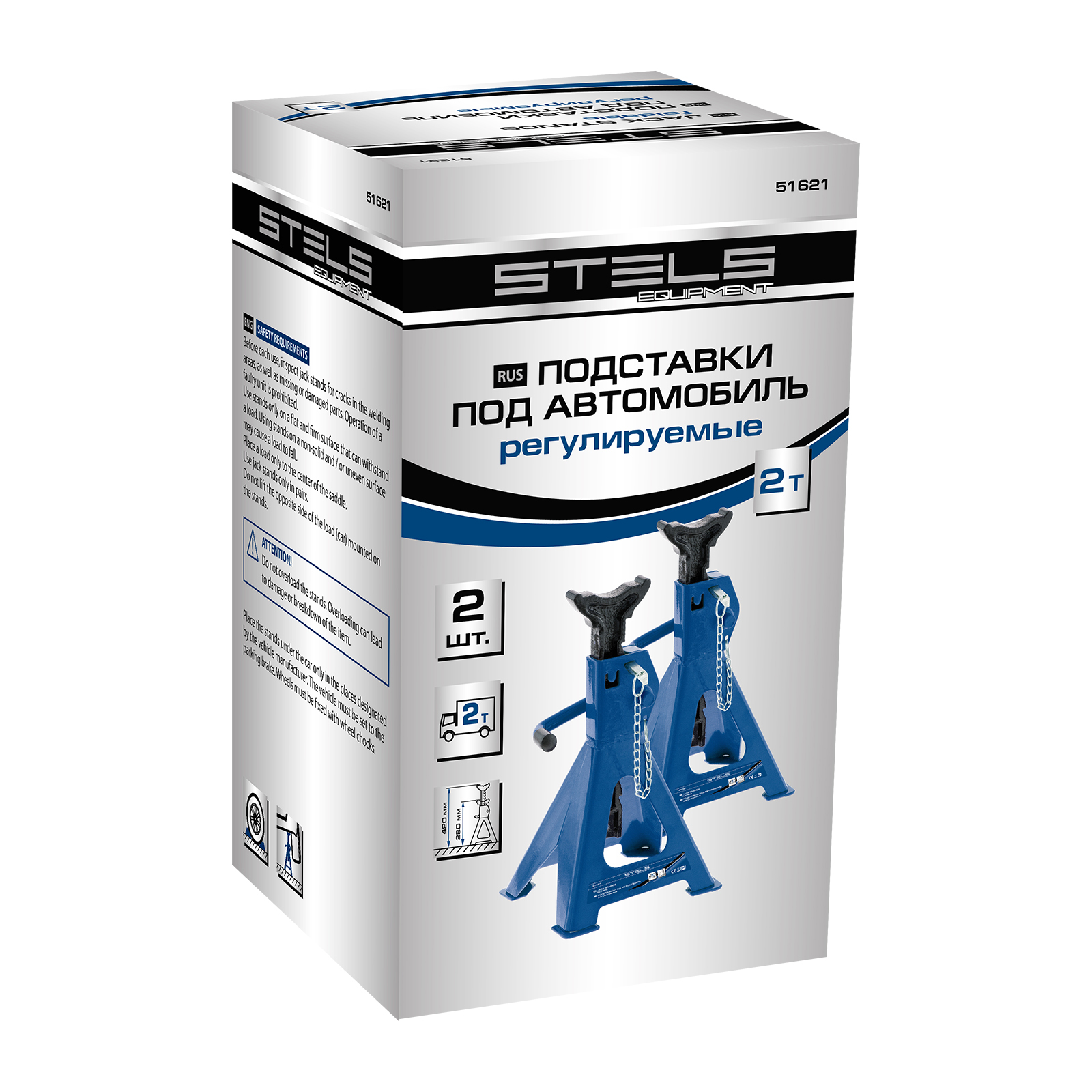 Регулируемые подставки под автомобиль Stels 51621 грузоподъемностью 2 т, с высотой подъема 280-420 мм, 2 шт. в комплекте, используются в качестве дополнительной поддержки во время ремонта автотранспорта. Подставки удерживают автомобиль на необходимой высоте при помощи регулируемых штоков с зубчатым механизмом фиксации. Каждая стойка снабжена страховочным штифтом, что исключает риск случайного опускания штока. Подставки будут полезны для профессионального и самостоятельного авторемонта.