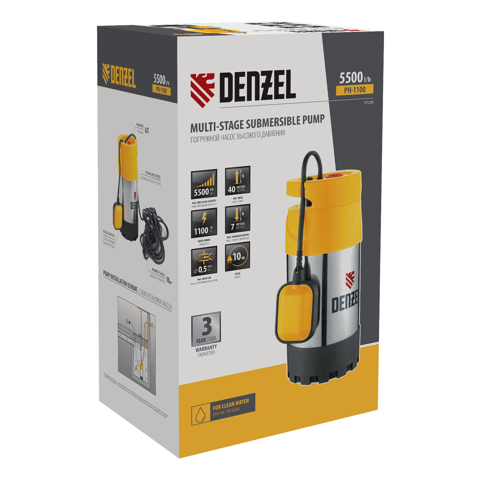 Погружной насос высокого давления PH1100, 1100Вт, подъем 40м, 5500 л/ч Denzel в Москве