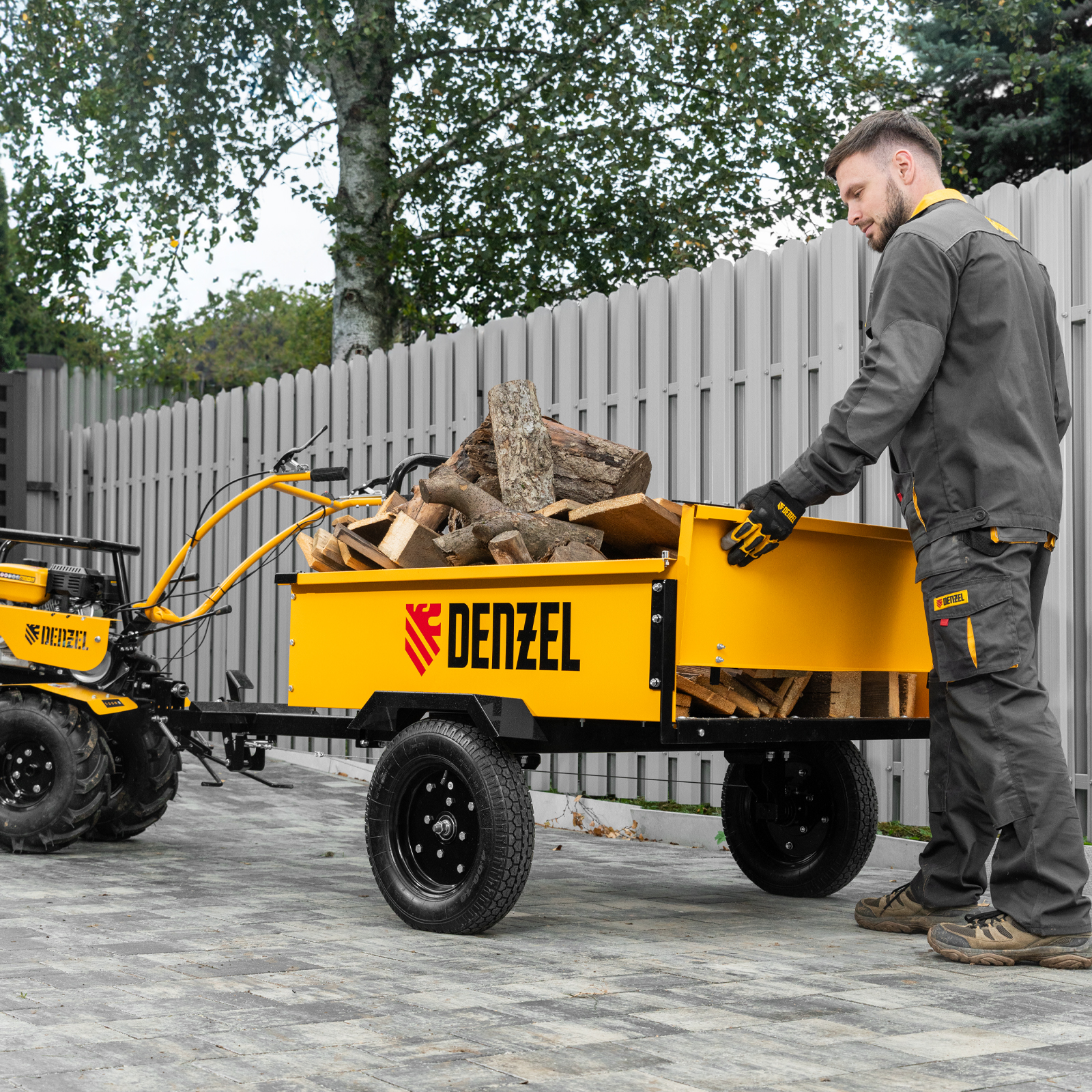 Прицеп Denzel TT-500 59950 с оцинкованным кузовом и регулируемой сцепкой, с колесами размером 4.00-10, в упаковке, имеет общую грузоподъемность 500 кг. Позволяет использовать мотоблок в качестве транспортного средства, а также перевозить различные грузы. Прицеп самосвального типа с функцией опрокидывания удобен для выгрузки. Приспособление пригодится в сельском хозяйстве и коммунальной сфере.