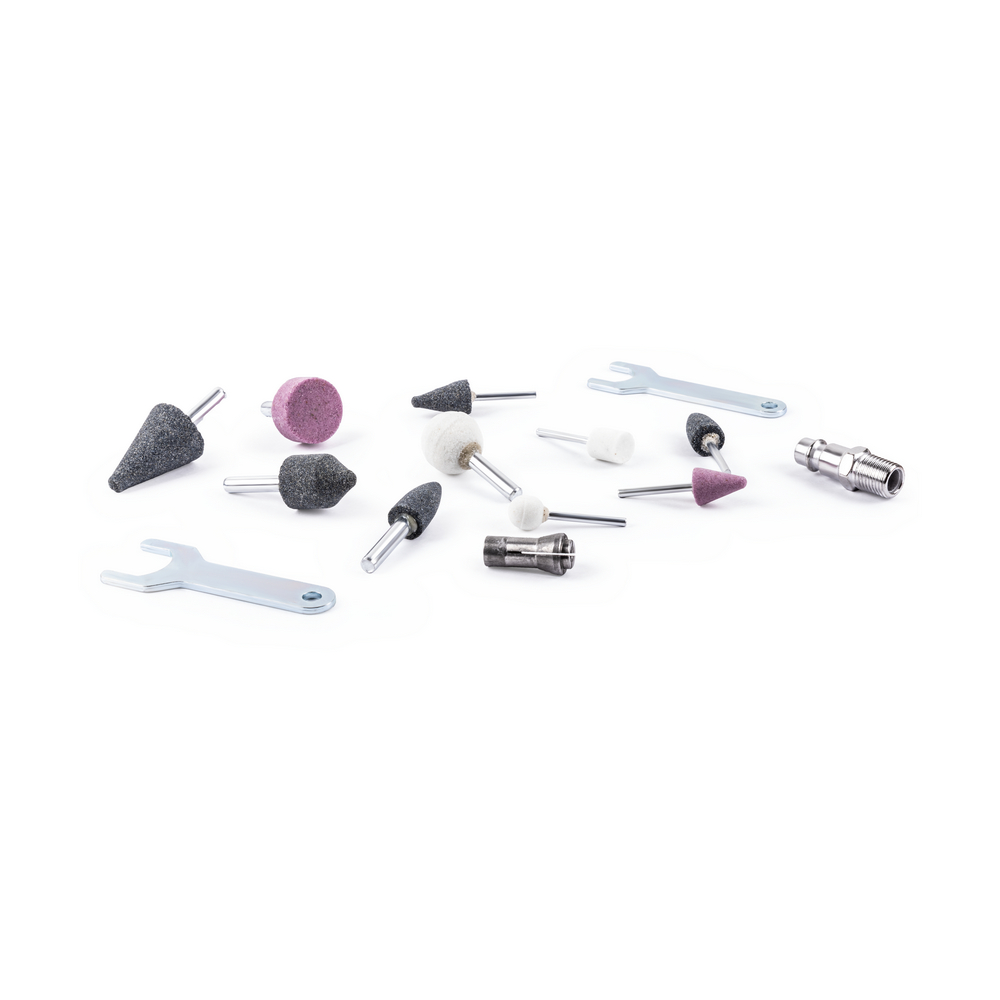 Насадки-камни - по 5 шт. на зажимную втулку (цангу) каждого размера, 3 и 6 мм. Соединитель Rapid M "папа" - 1/4" M для быстрого подключения к воздушной магистрали. Высокопроизводительный инструмент со скоростью вращения в 22000 об/мин и максимальным расходом воздуха 355 л/мин при рабочем давлении в 6,3 - 8 бар. Будьте внимательны при подборе компрессора с соответствующей производительностью, в случае если требуется долгая непрерывная работа. Перед первым применением пожалуйста прочтите инструкцию по эксплуатации.