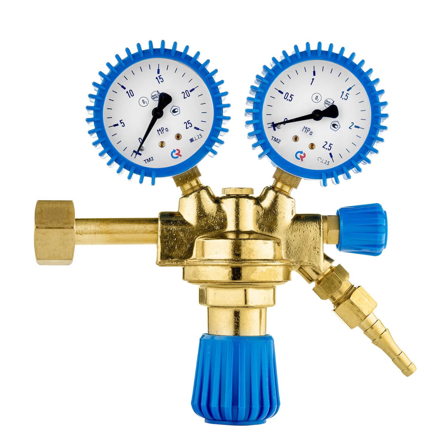 Редуктор с литым латунным корпусом. На редуктор установлены эргономичные задающие винты. Манометры дополнительно защищены резиновыми кожухами, которые предохраняют устройство от механических повреждений.
