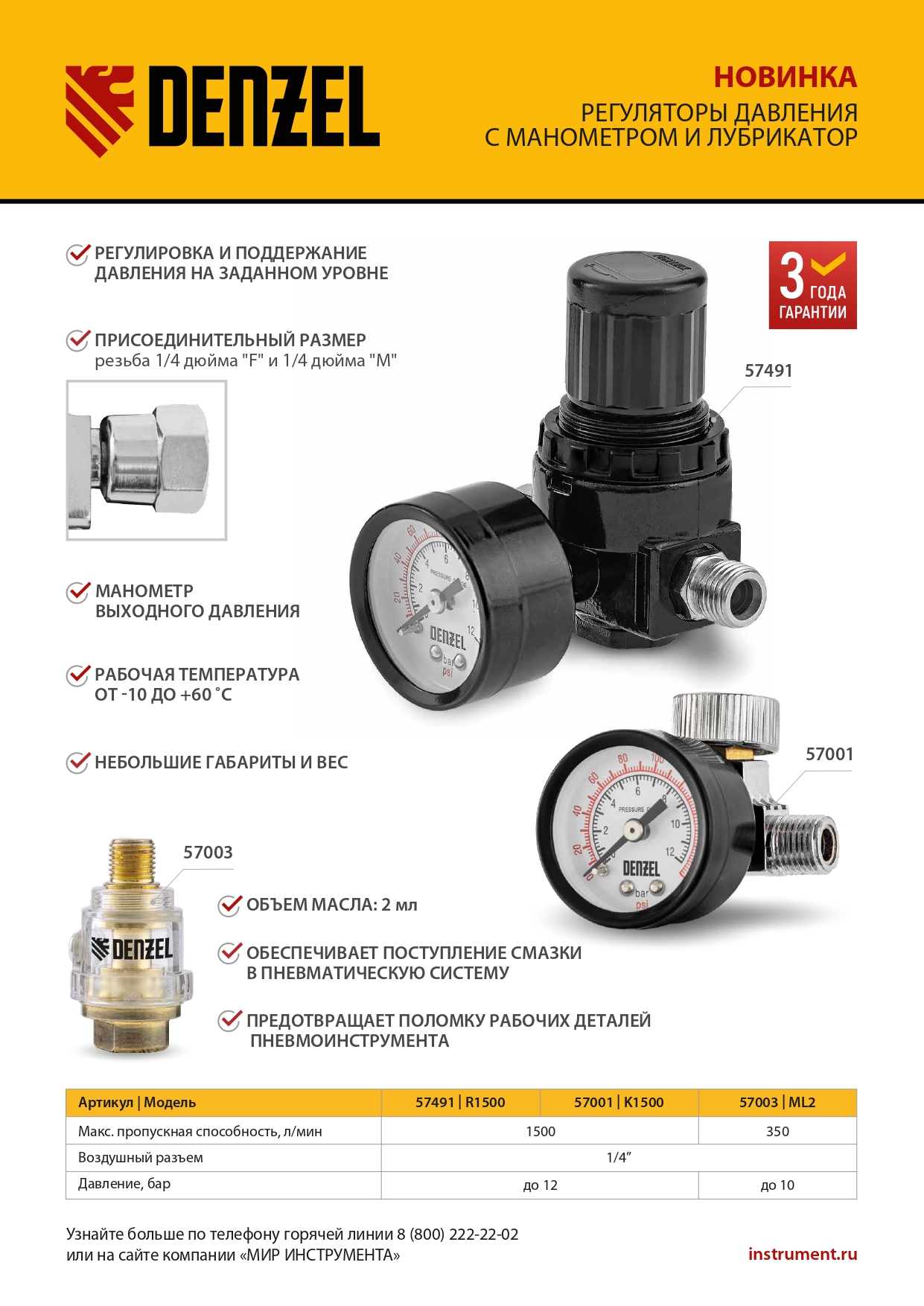 Регулятор давления с манометром Denzel R1500 57491, с присоединительным размером 1/4", имеет пропускную способность 1500 л/мин, и предназначен для установки и поддержания на заданном уровне давления до 12 бар. Подключается к компрессору и позволяет обеспечить эффективную работу пневмоинструмента.