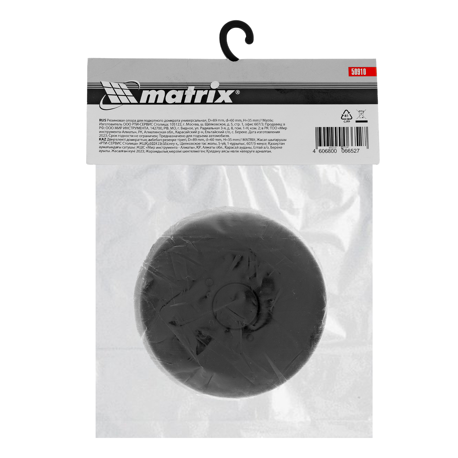 Резиновая опора Matrix 50910, с верхним диаметром 89 мм и нижним диаметром 60 мм, толщиной 35 мм, используется в качестве смягчающей накладки на подкатной домкрат. Снижает риск появления вмятин, царапин и сколов краски на кузове автомобиля, что позволяет произвести его аккуратный подъем. Также защищает от повреждений верхнюю опору домкрата.