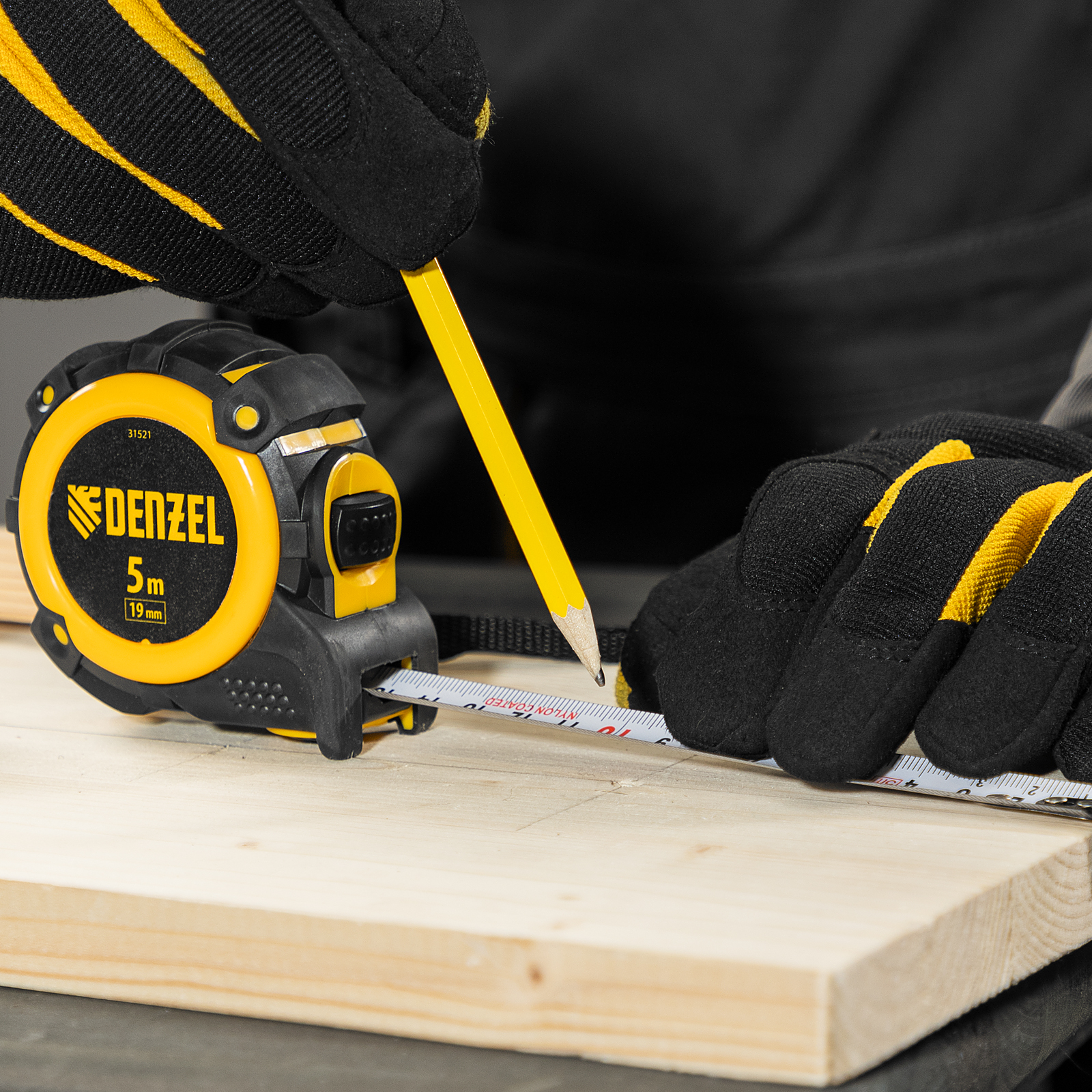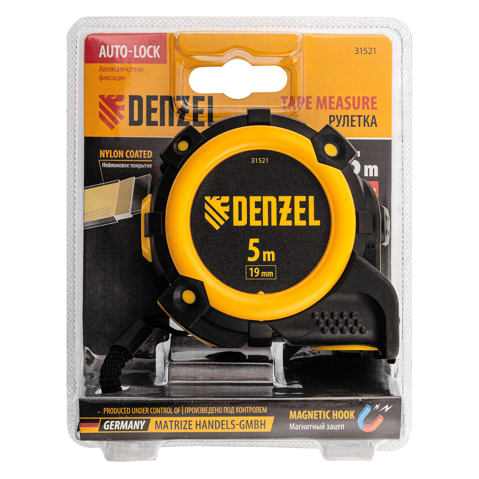 Рулетка 5м х 19мм, автоматич. фиксац., нейлон. покрытие, магнит. зацеп, двухстор. разметка Denzel в Москве