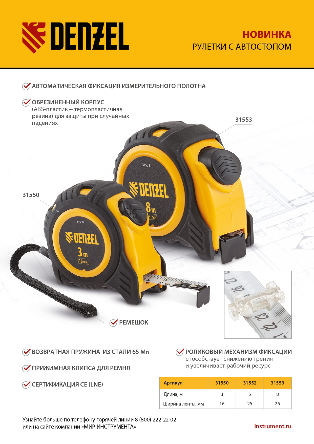 - Удобная эксплуатация — автоматическая фиксация ленты облегчает проведение измерений.