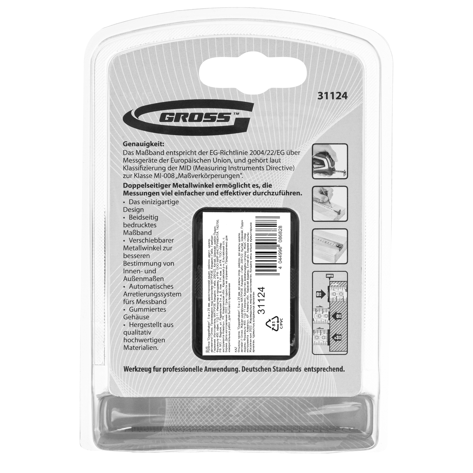 Автоматическая рулетка Gross «Doppelhaken» 31124 с двухсторонним зацепом, лентой размером 5 м x 25 мм, с двухсторонней шкалой и нейлоновым покрытием, предназначена для проведения измерений стен, полов, различных материалов и конструкций. Пригодится на строительной площадке и в быту, благодаря широкой упругой ленте удобна для работы в труднодоступных местах.