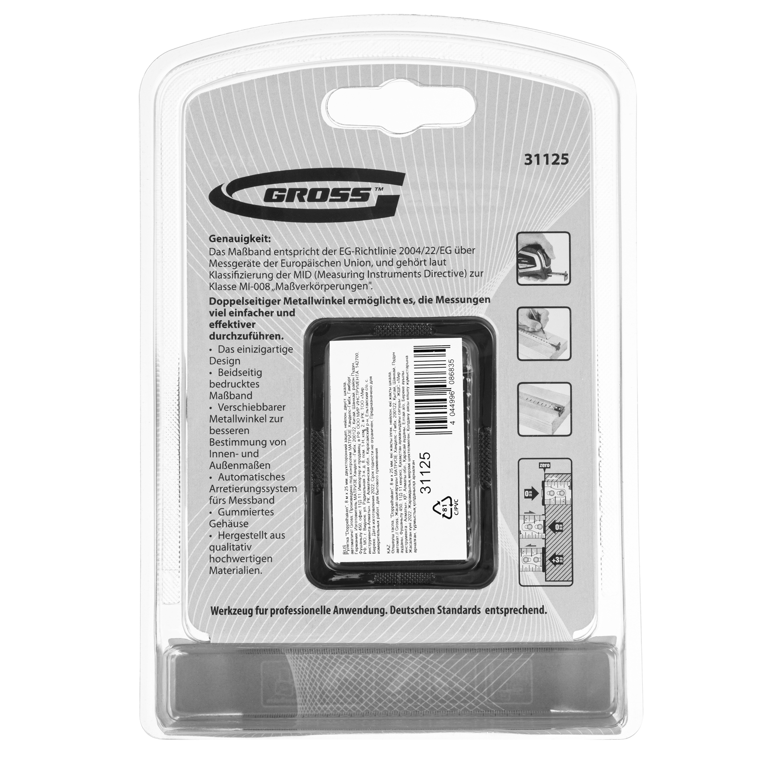 Автоматическая рулетка Gross «Doppelhaken» 31125 с двухсторонним зацепом, лентой размером 8 м x 25 мм, с двухсторонней шкалой и нейлоновым покрытием, предназначена для проведения измерений стен, полов, различных материалов и конструкций. Пригодится на строительной площадке и в быту, благодаря широкой упругой ленте удобна для работы в труднодоступных местах.