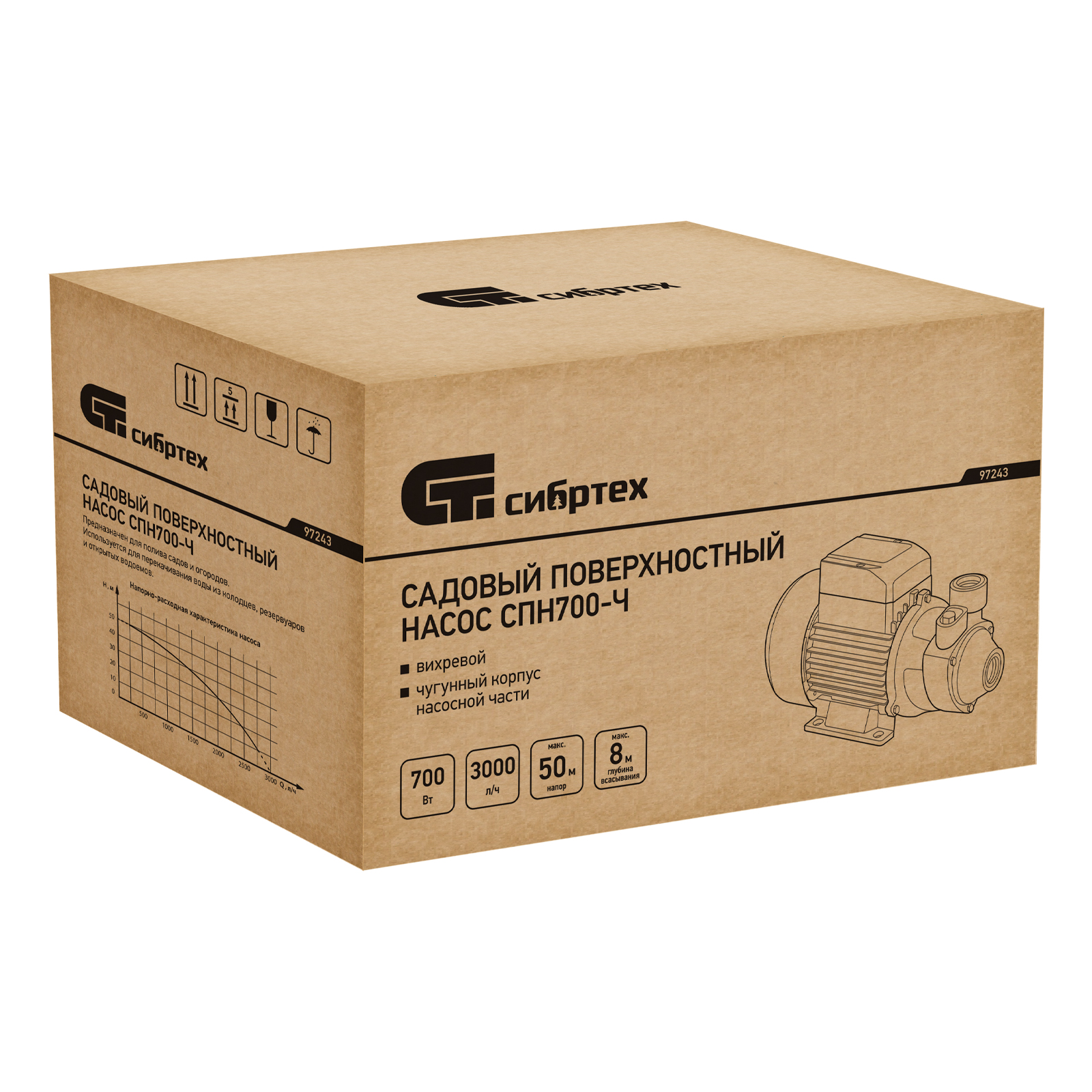 Садовый поверхностный насос СПН700-Ч, 700 Вт, напор 50 м, 3000 л/ч, чугун Сибртех в Москве