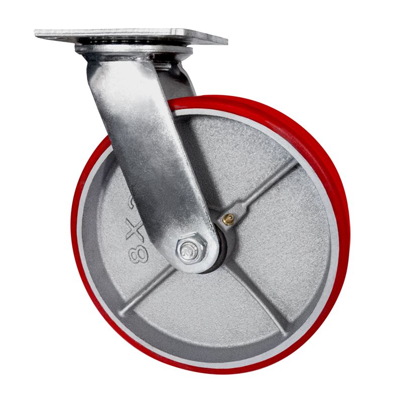 Колесо большегрузное полиуретановое поворотное SCP55 предназначено для оснащения складского, транспортного строительного оборудования и тяжелых механизмов. Шинка выполнена из полиуретана. Материал отличается высокой износостойкостью и большой грузоподъемностью. Колесо отлично переносит динамические, статические и ударные нагрузки, хорошо служит на любых твердых поверхностях. Обод выполнен из чугуна, оснащен роликовым подшипником в оси и смазочным ниппелем. В поворотном механизме установлен двухрядный шариковый подшипник с пресс-масленкой. Кронштейн — сварной, изготовлен из оцинкованной листовой стали. Диапазон температур — от -35ºC до +50ºC.