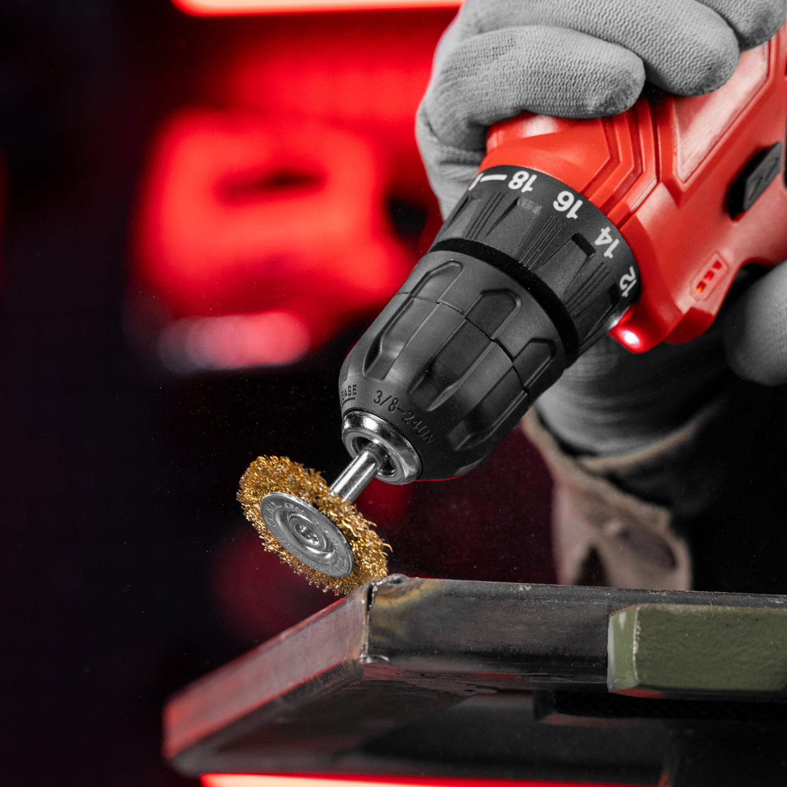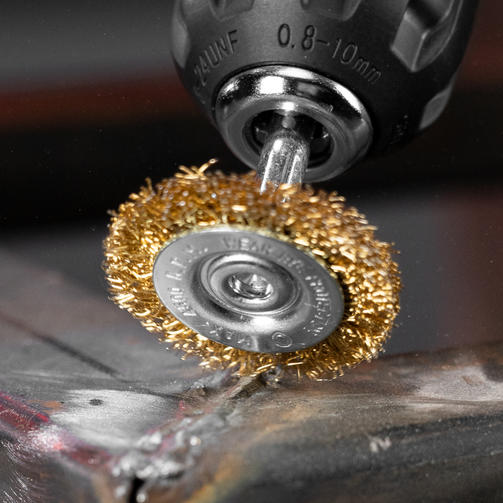 Плоская щетка для дрели Matrix 74442 диаметром 40 мм, со шпилькой и щетиной из латунированной витой проволоки, предназначена для бережной очистки металлических, деревянных, пластиковых поверхностей от загрязнений, старых лакокрасочных материалов и ржавчины. Витая проволока диаметром 0,3 мм проникает в труднодоступные места: пазы, углы, изгибы, узкие участки. Насадку применяют для придания поверхности нужной шероховатости или подчеркивания структуры материала. Хвостовик диаметром 6 мм устанавливается в патрон электродрели, способной работать на рекомендуемой скорости 4500 об/мин. Во время работы следует использовать защитные очки, респиратор, наушники, спецодежду и обувь.