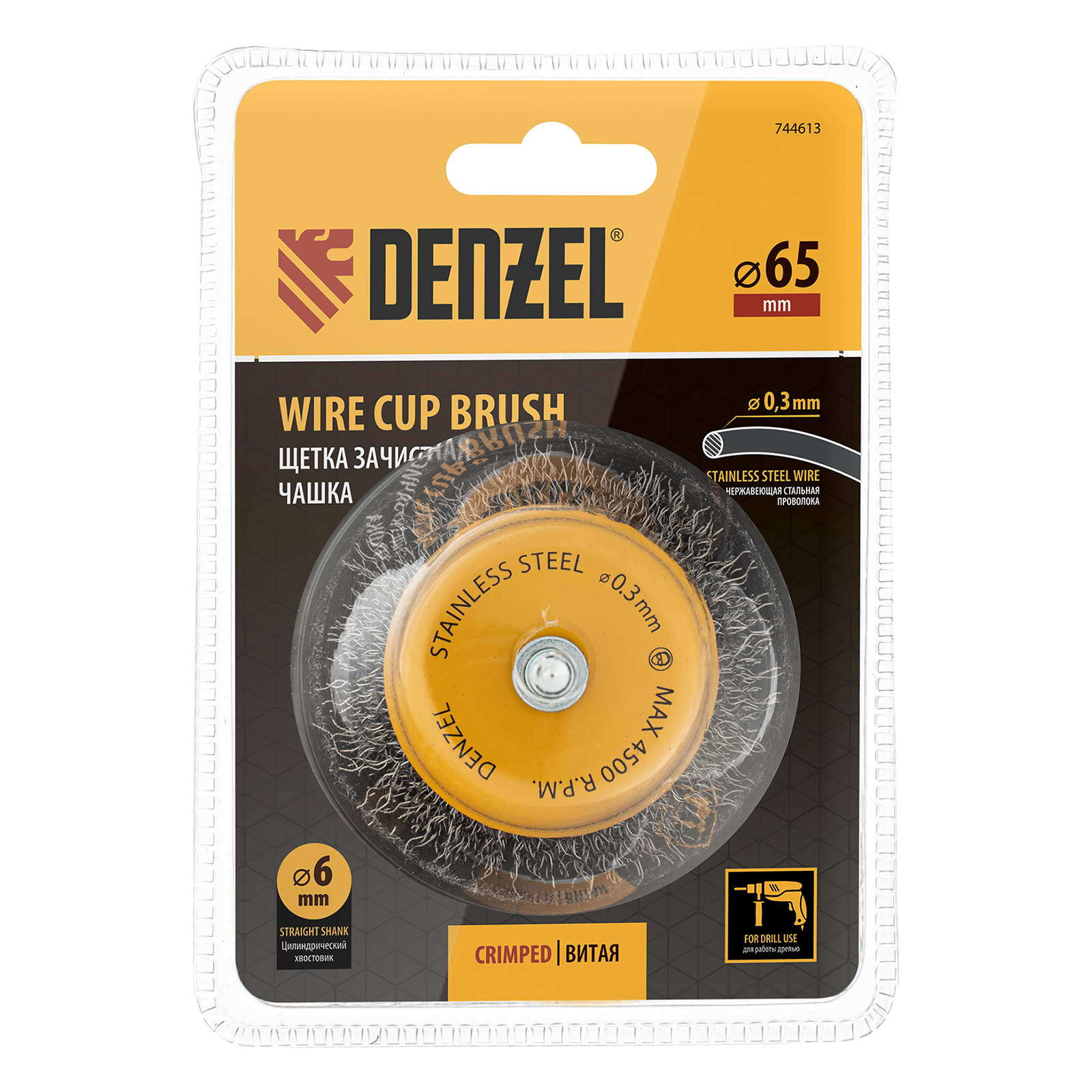 Щетка для дрели, 65 мм, Чашка, со шпилькой , нержавеющая витая проволока Denzel в Москве