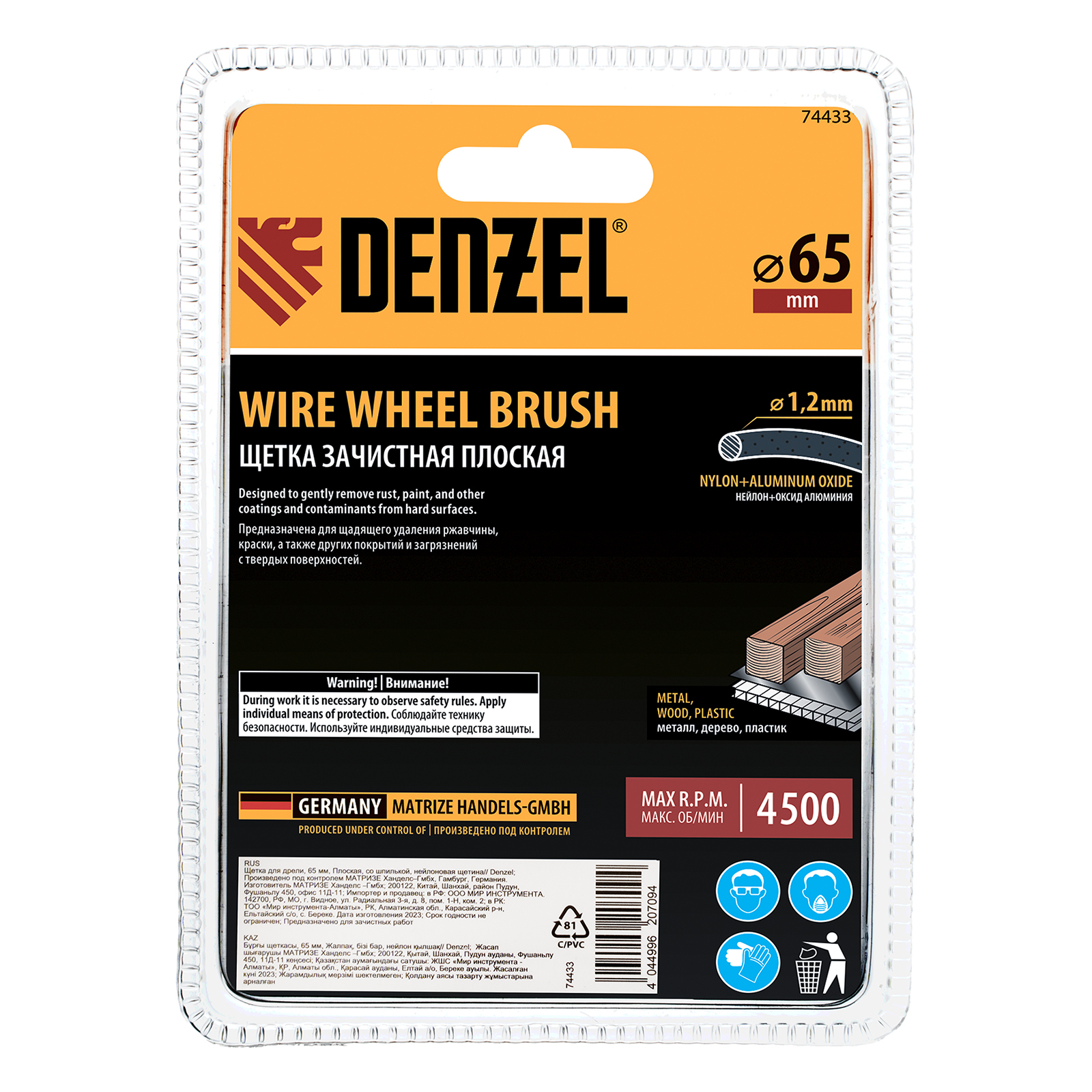 Щетка для дрели, 65 мм, Плоская, со шпилькой, нейлоновая щетина Denzel в Москве