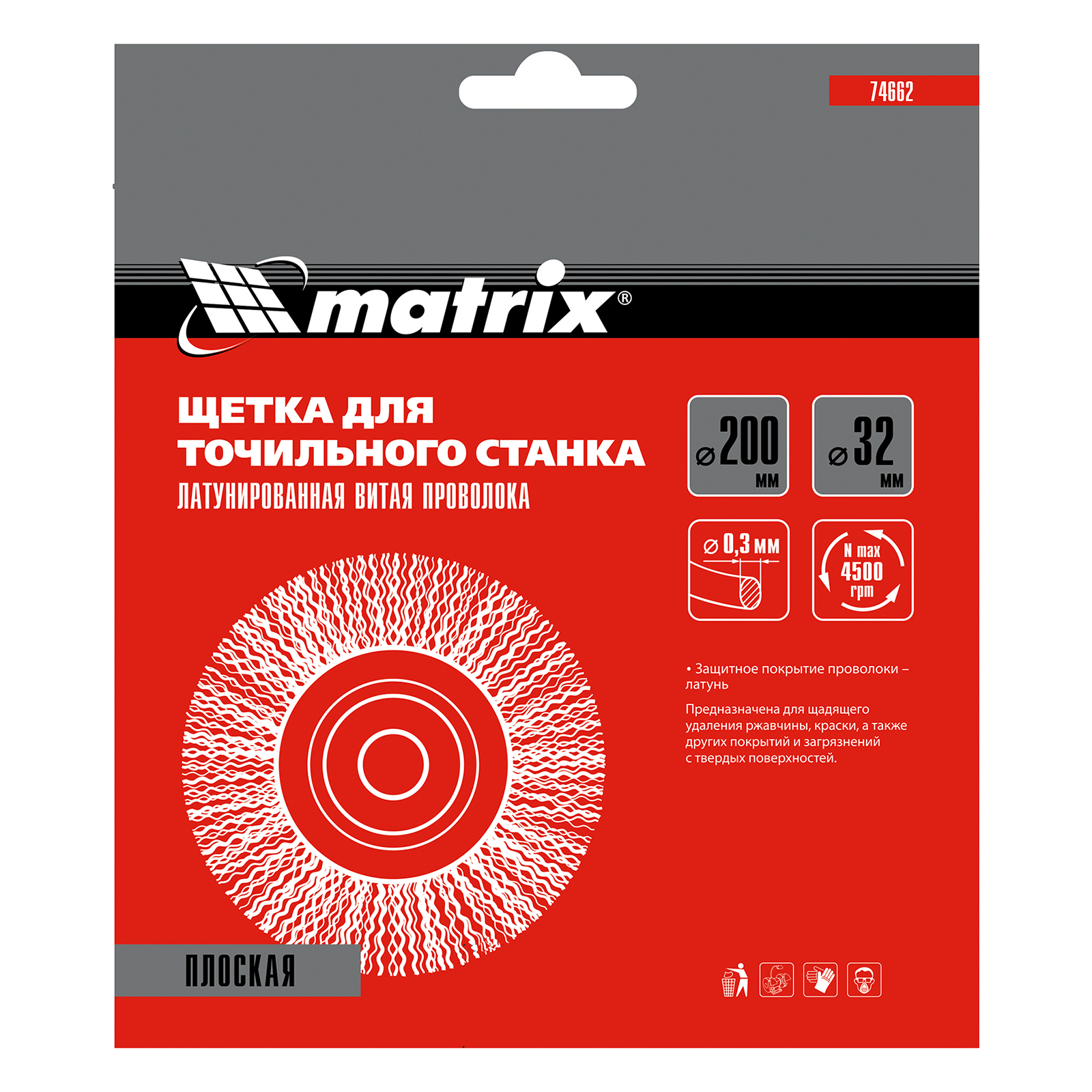 Плоская щетка Matrix 74662 диаметром 200 мм, с щетиной из латунированной витой проволоки, устанавливается на точило с посадочным размером 32 мм. Рекомендуемая скорость вращения — не более 4500 об/мин. Витая проволока позволяет в щадящем режиме зачистить тонкий слой ржавчины и лакокрасочных покрытий, удалить различные загрязнения с небольших или хрупких деталей. Благодаря плоской форме щетка подходит для обработки труднодоступных мест.