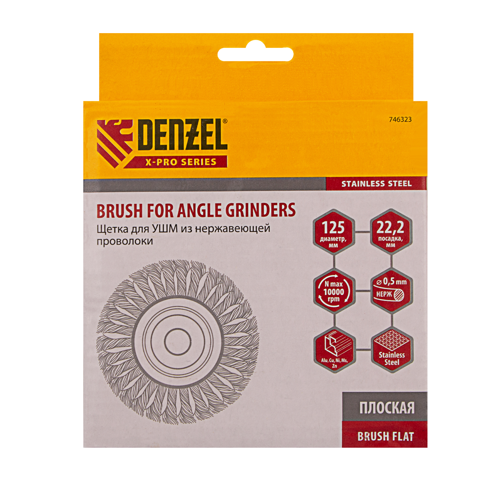 Плоская щетка для УШМ Denzel 746323 диаметром 125 мм, с посадкой 22,2 мм, с щетиной из крученой нержавеющей проволоки 0,5 мм, предназначена для снятия толстого верхнего слоя с металлических, деревянных, бетонных поверхностей. Удаляет загрязнения, ржавчину, старые лакокрасочные покрытия, заусенцы, окалину с ровных поверхностей и в труднодоступных местах. Оптимальна для обработки изделий из нержавеющей стали, а также зачистки сварных швов. Щетку устанавливают на фланец углошлифовальной машины, что удобно для выполнения большого объема работ, не требующих частой смены насадок. Рекомендуемая максимальная скорость вращения 10000 об/мин. Во время работы обязательно использование средств индивидуальной защиты. Щетка будет полезна на строительной площадке, производственном предприятии, а также пригодится в быту.