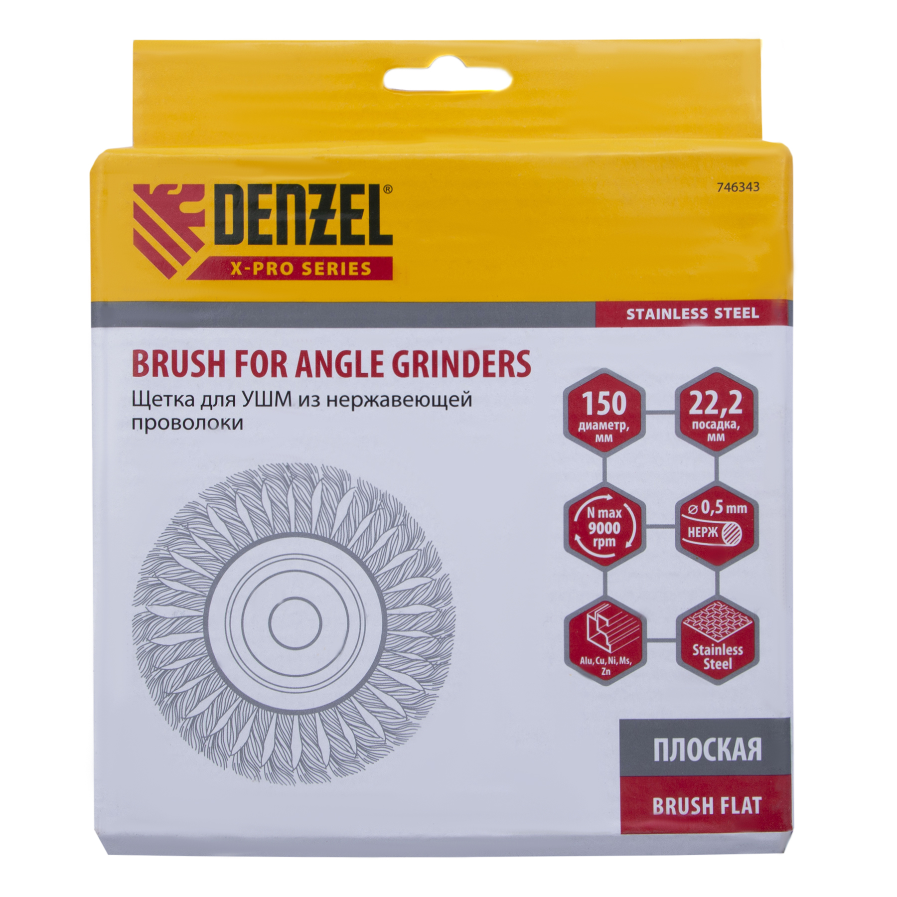 Щетка для УШМ, 150 мм, "Плоская", крученая нержавеющая проволока 0.5мм, посадка 22.2 мм Denzel в Москве