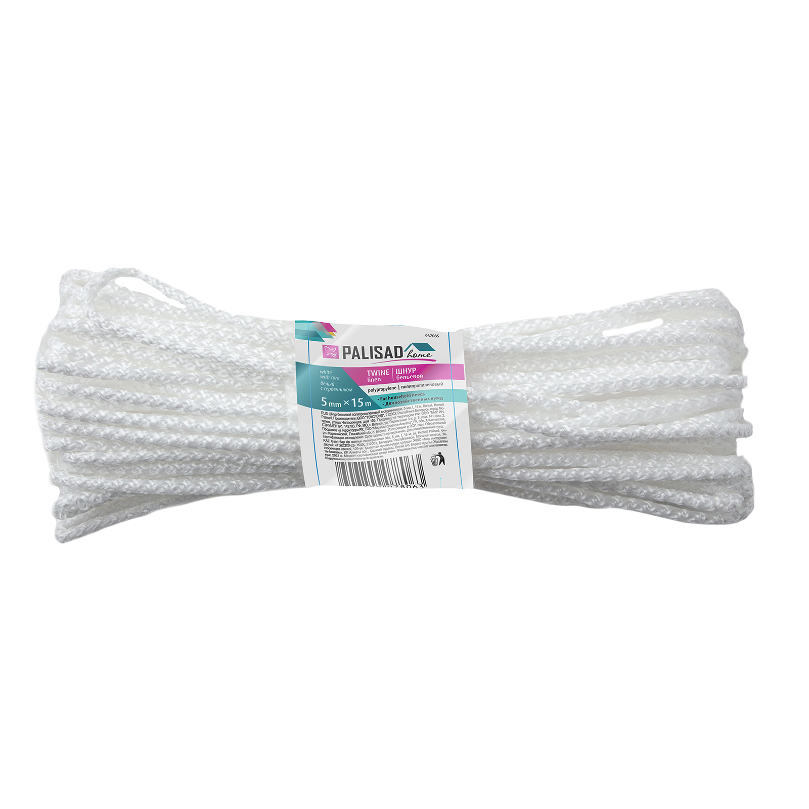 Белый полипропиленовый бельевой шнур Palisad Home 937085 с сердечником, диаметром 5 мм и длиной 15 м, используется для сушки белья, а также в качестве хозяйственной веревки в быту, на рыбалке или в походе. От обычной бельевой веревки для сушки он отличается сердечником из полипропилена, увеличивающим стойкость к нагрузкам. Шнур с полипропиленовой оплеткой выдерживает разрывную нагрузку до 70 кгс, устойчив к растяжению и не провисает под весом мокрых вещей.
