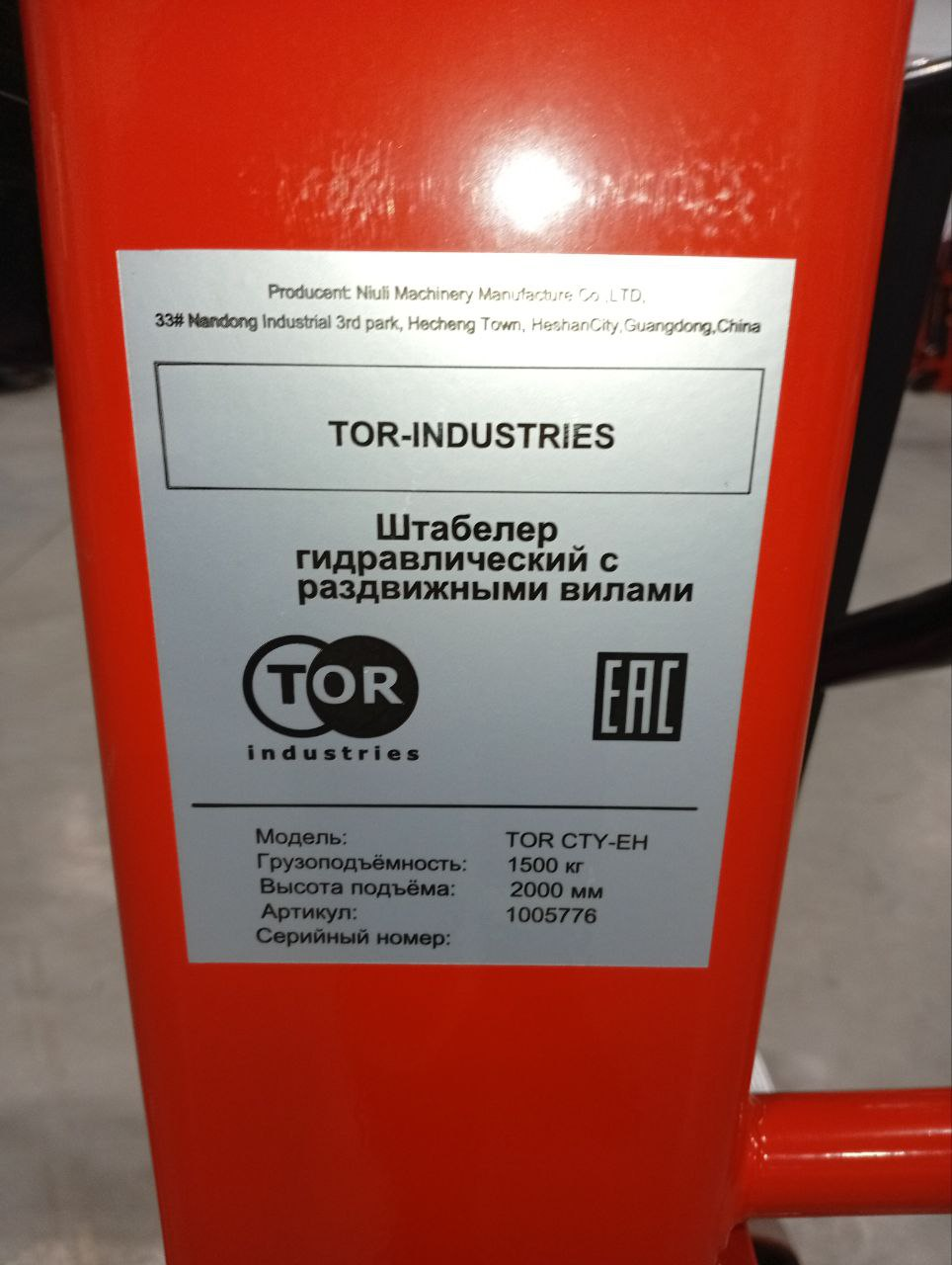 Штабелер гидравлический 1,5 т 2,0 м TOR CTY-EH с раздвижными вилами в Москве