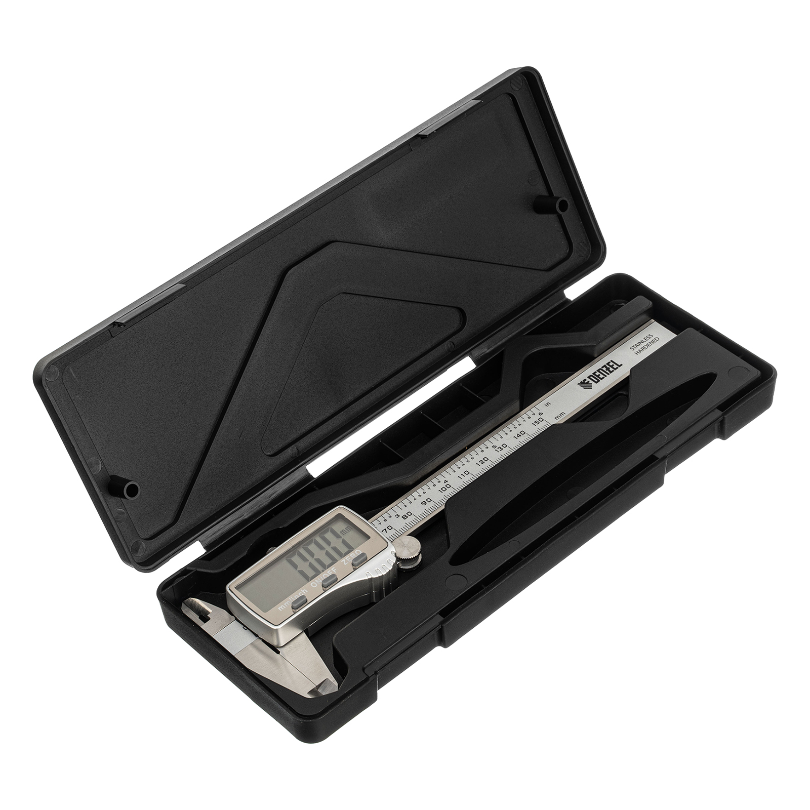 - Безопасная транспортировка и хранение — штангенциркуль упакован в прочный пластиковый кейс.