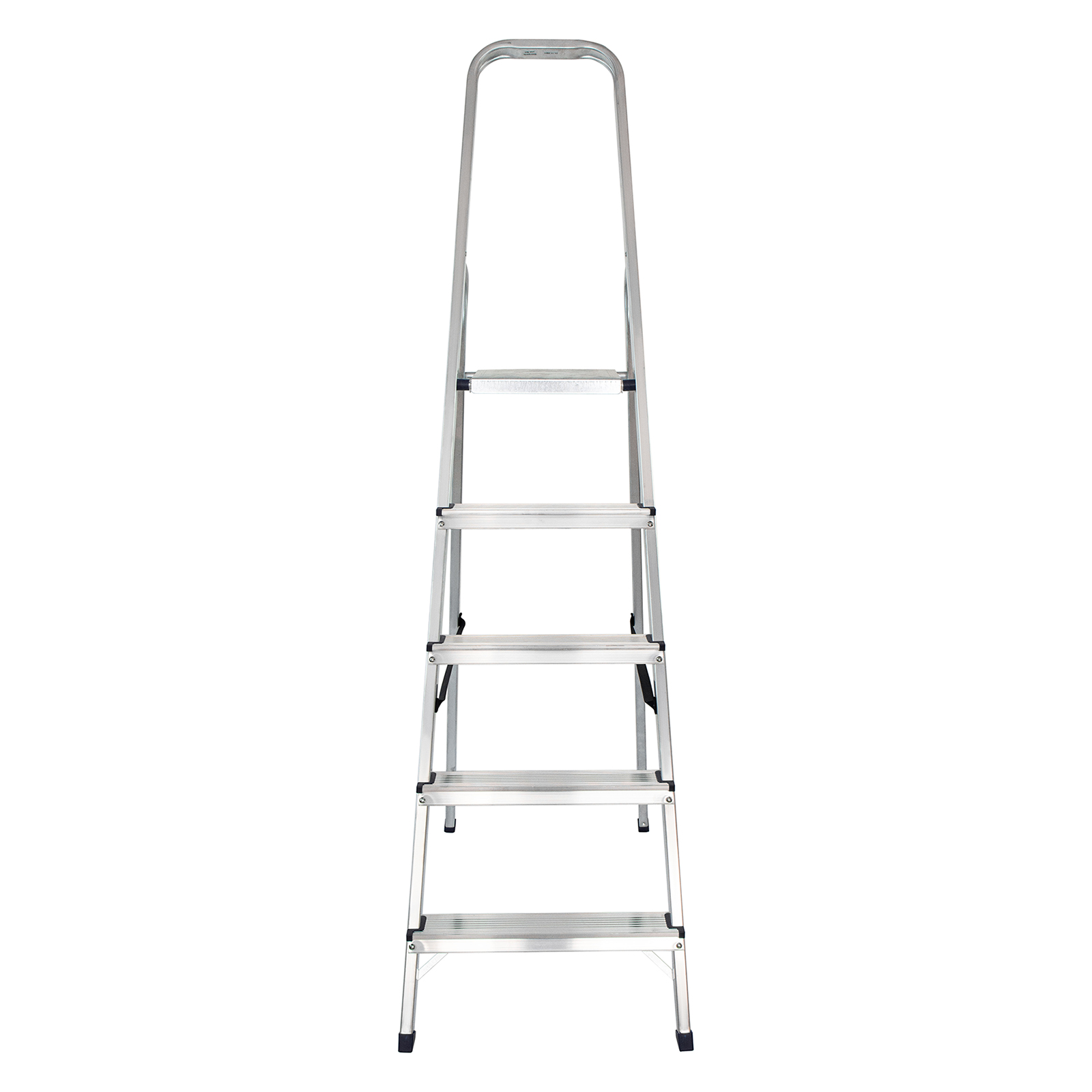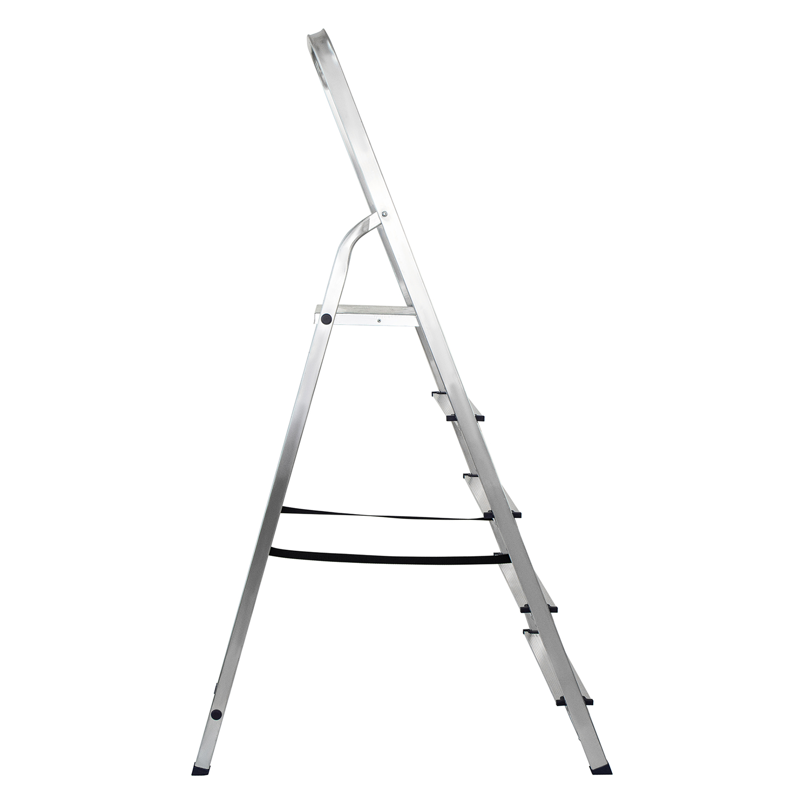 - Надежность — рама из прямоугольного алюминиевого профиля выдерживает нагрузку до 150 кг, широкие ступени закреплены заклепками, страховочные стяжки повышают прочность конструкции.