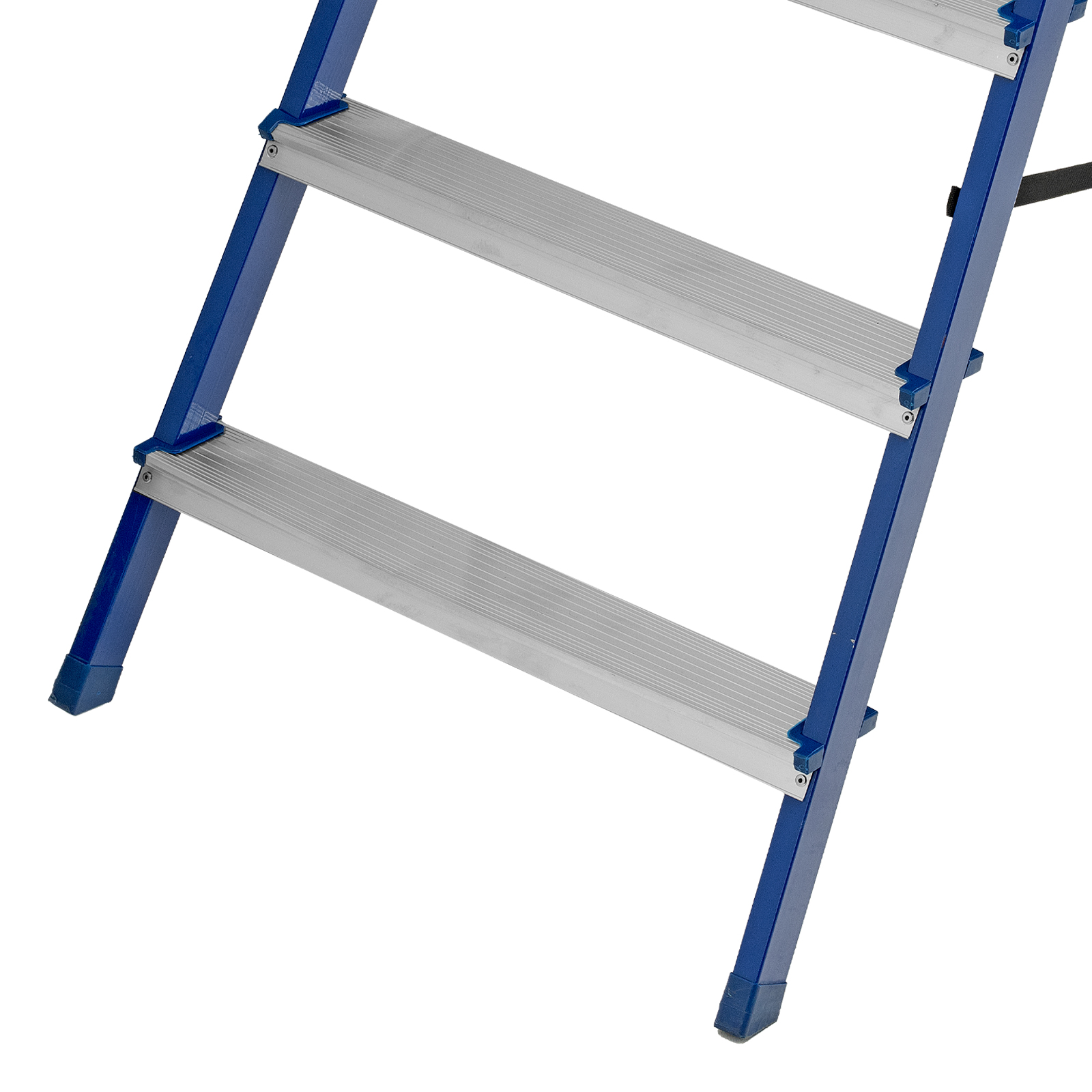 - Надежность — рама изготовлена из профилированной стали, стальная верхняя площадка с зацепами прочно фиксирует стремянку в рабочем положении, страховочные ленты придают дополнительную прочность конструкции.