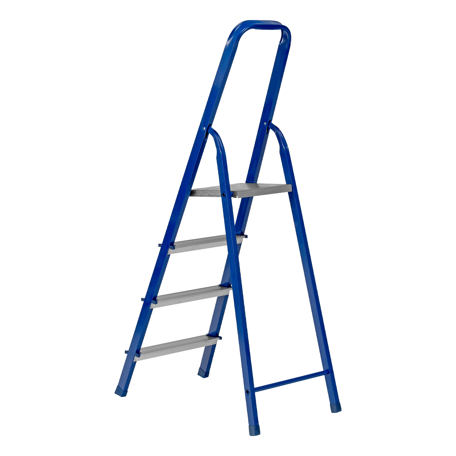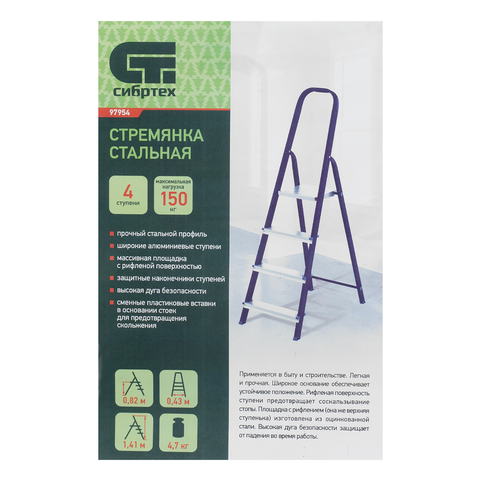 Стремянка Сибртех 97954 со стальным профилем и 4 ступенями, 3 из которых алюминиевые, упрощает доступ к предметам, расположенным на антресолях, шкафах, высоких полках. Также будет полезна для проведения отделочных и монтажных работ. Лестница обладает высокой прочностью при весе 5,2 кг и выдерживает нагрузку до 150 кг. Площадка находится на высоте 79,4 см от опорной поверхности, рабочая высота стремянки составляет 279,4 см (при среднем росте пользователя 170 см).