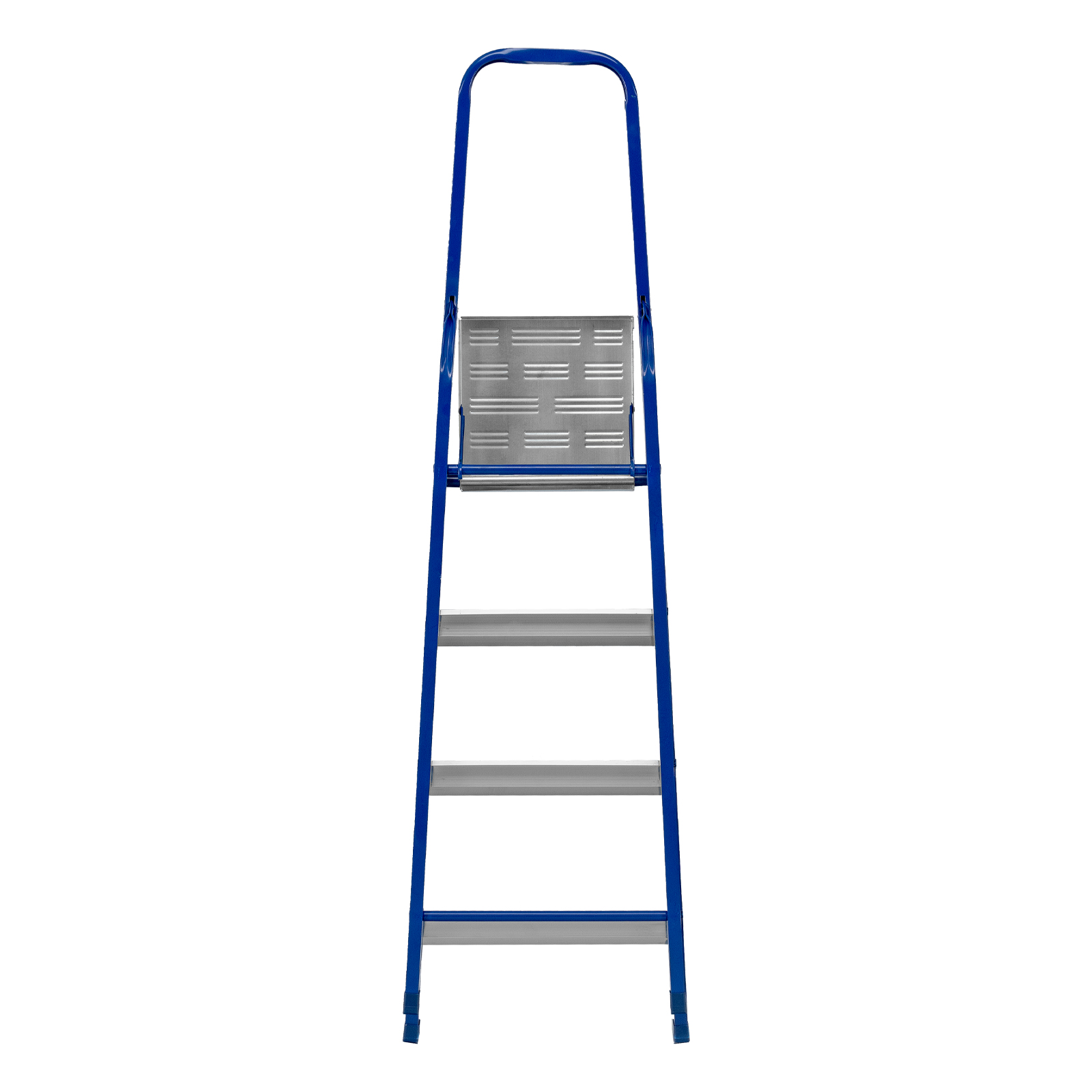 - Надежная конструкция — рама изготовлена из профилированной стали, стальная верхняя площадка с зацепами прочно фиксирует стремянку в рабочем положении.