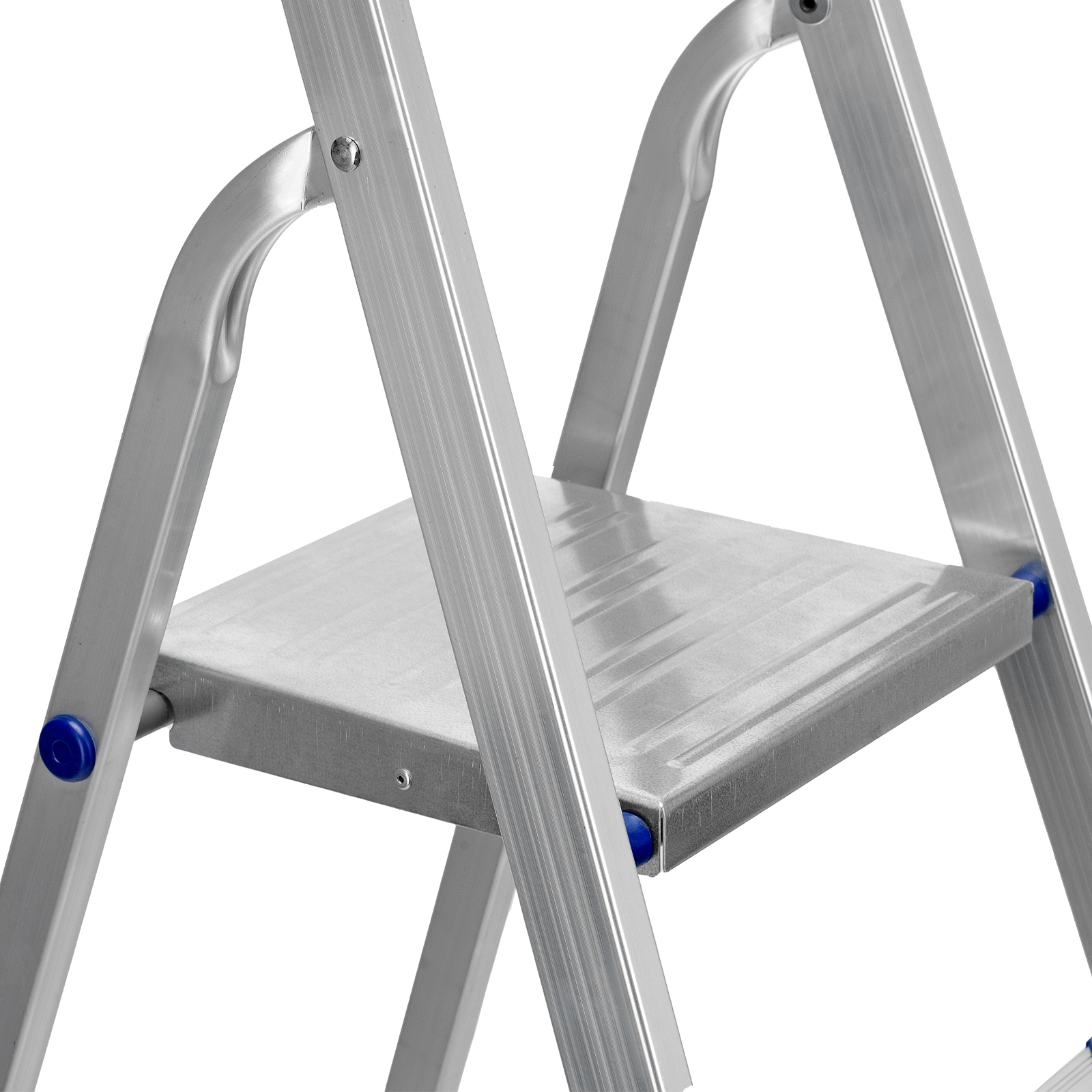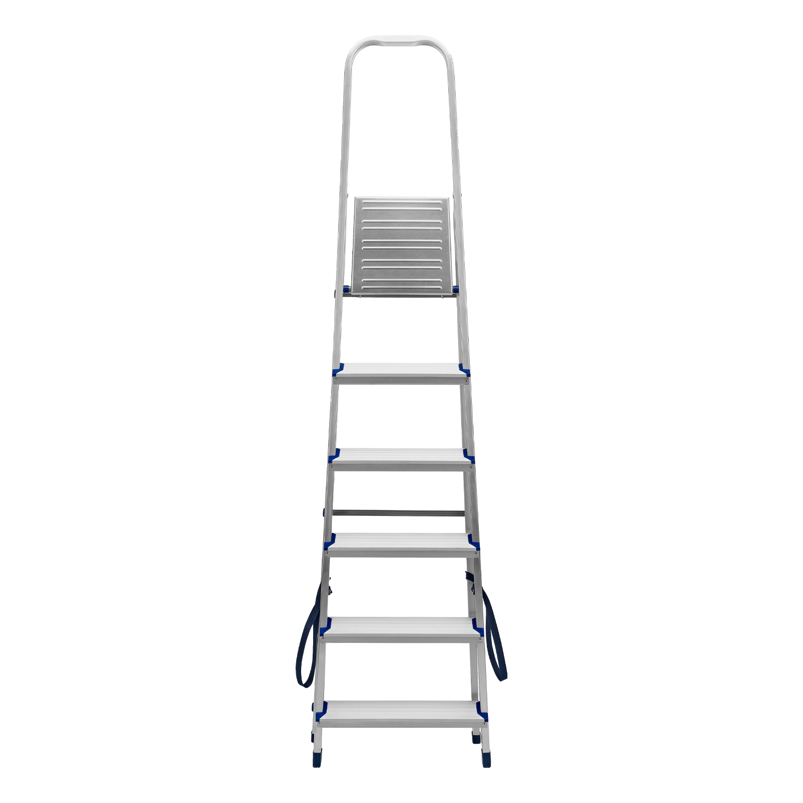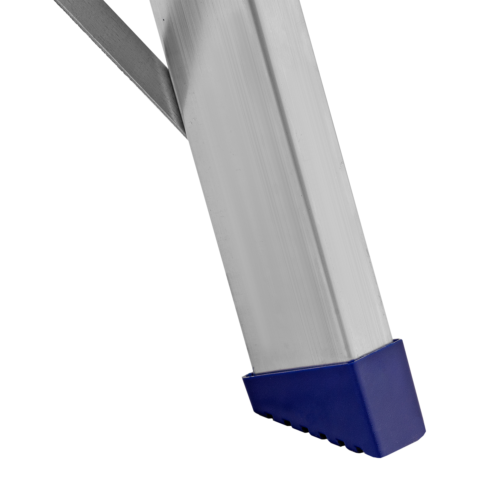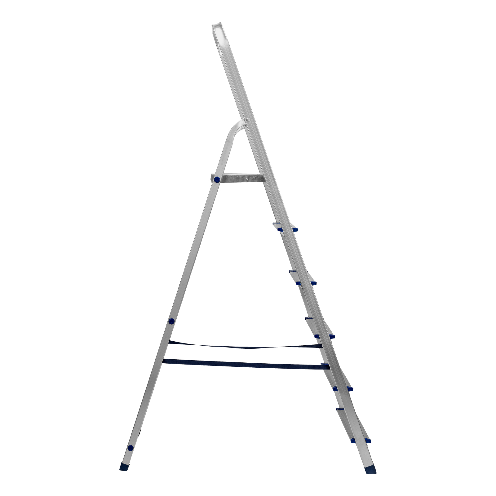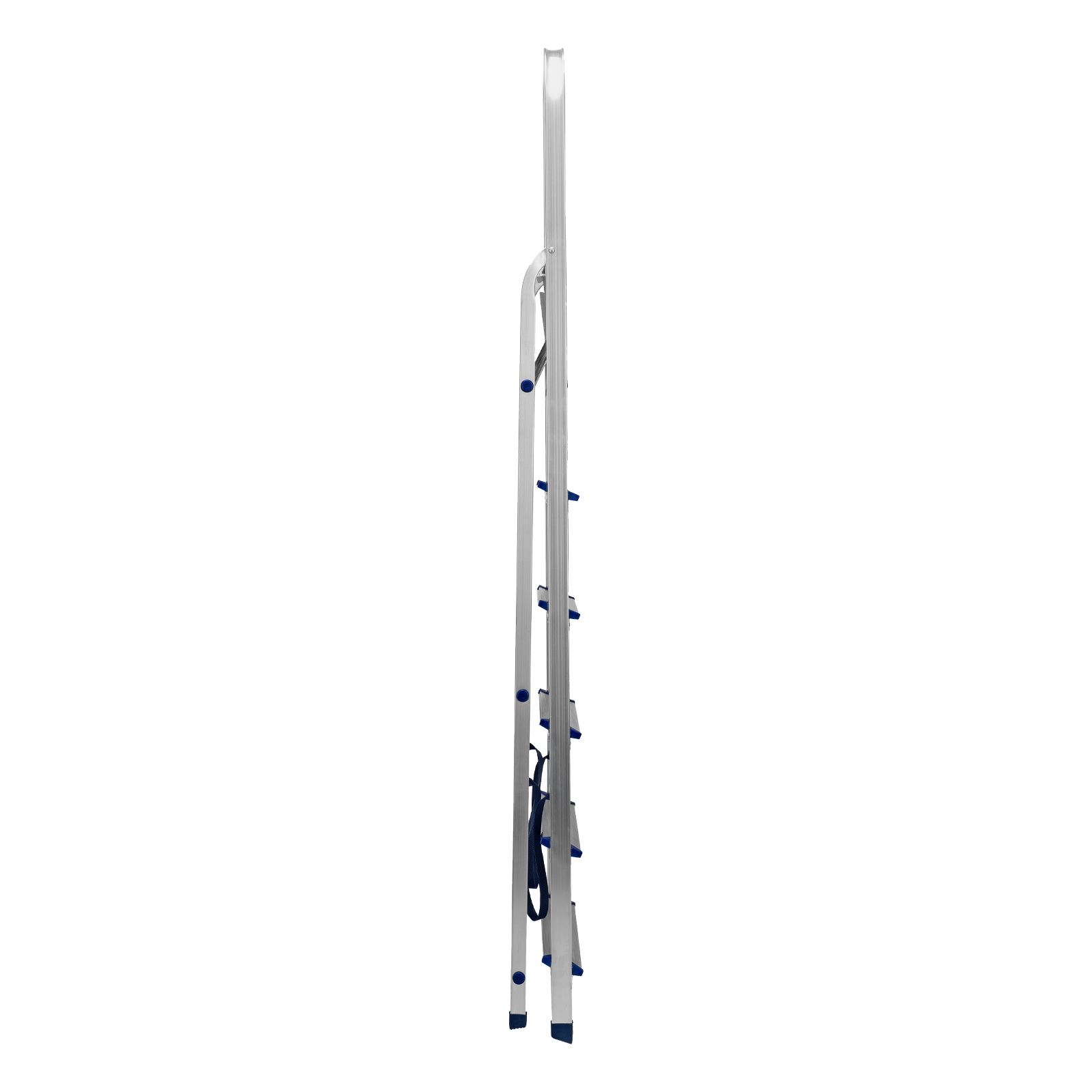 - Надежность — рама из прямоугольного алюминиевого профиля выдерживает нагрузку до 150 кг, широкие ступени закреплены заклепками, страховочные стяжки повышают прочность конструкции.