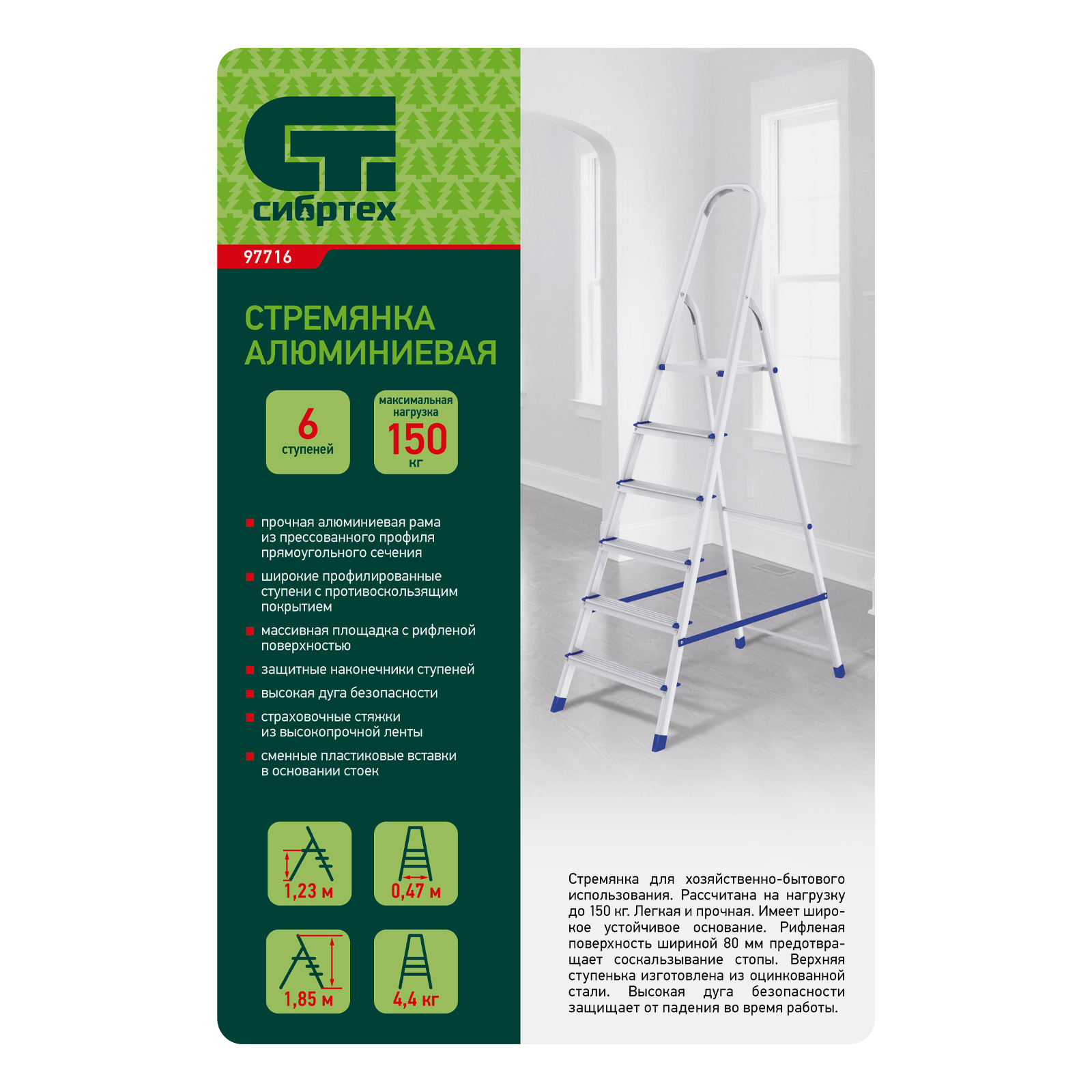 Стремянка алюминиевая Сибртех 97716 с 6 ступенями предназначена для выполнения работ на высоте, превышающей человеческий рост. Высокая дуга безопасности обеспечивает устойчивое положение пользователя. Площадка находится на высоте 123,3 см от опорной поверхности, рабочая высота стремянки составляет 323,3 см (при среднем росте пользователя 170 см). Стремянка пригодится во время строительных и ремонтных работ, позволит без лишних усилий повесить картину или шторы, покрасить стену, достать нужную вещь с антресолей или верхней полки шкафа, а также решить много других бытовых задач.