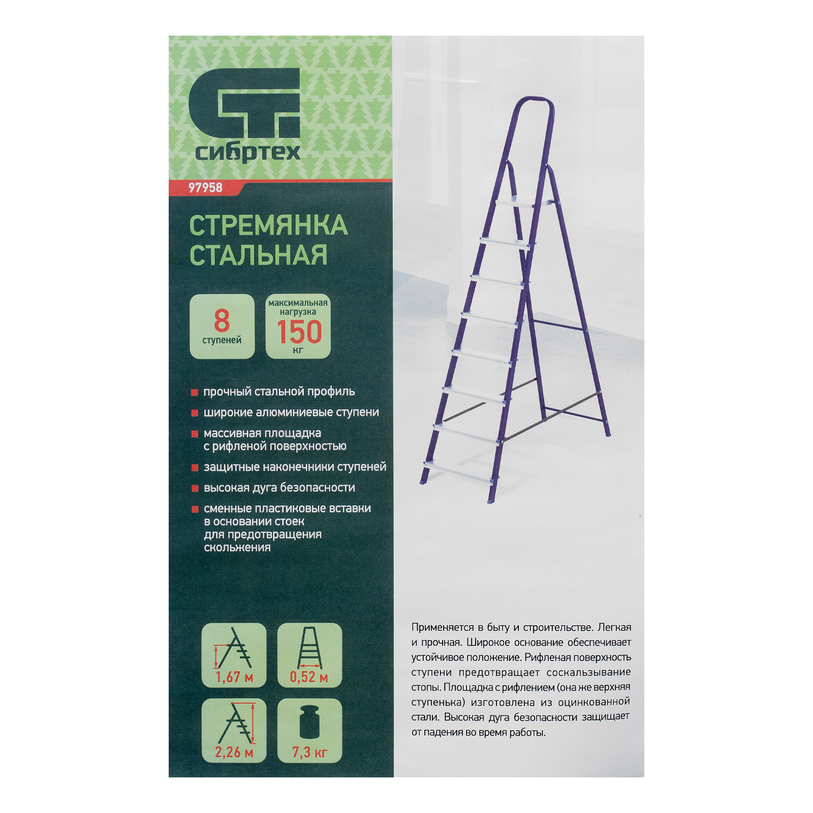 Стремянка, 8 ступеней, стальной профиль, алюминиевые ступени Сибртех в Москве