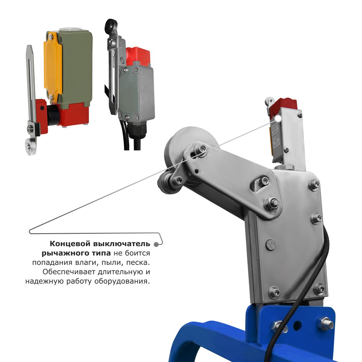 - Концевой выключатель рычажного типа не боится попадания влаги, пыли, песка. Обеспечивает длительную и надежную работу оборудования.