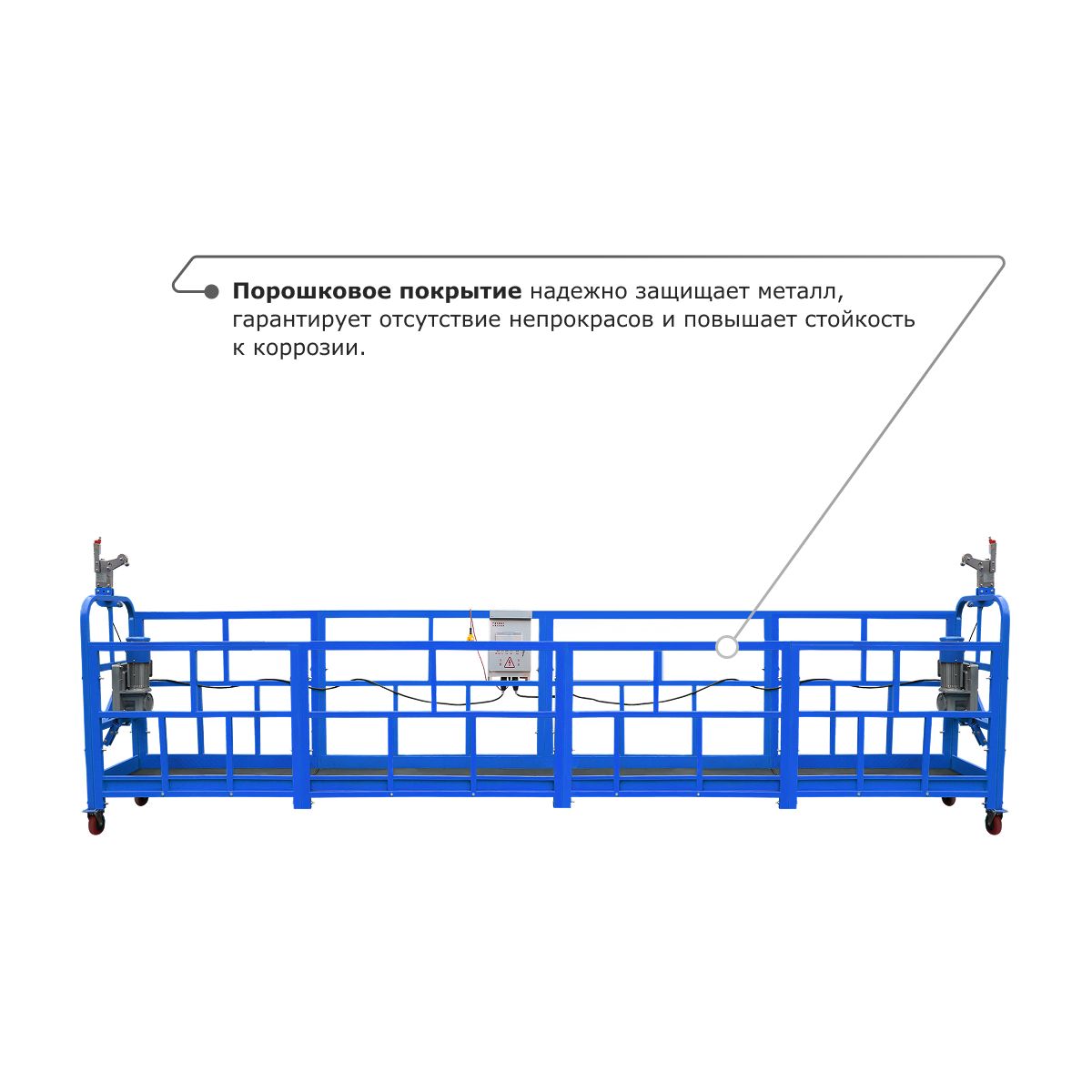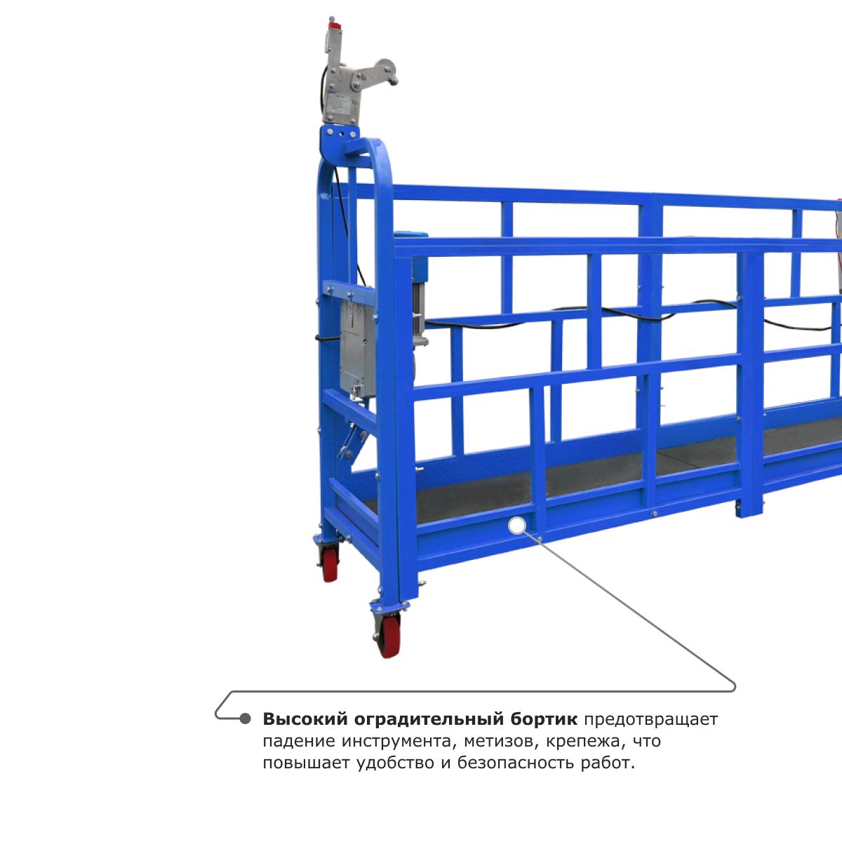 - Металлический отвод троса обеспечивает надежную защиту корпуса люльки и самого троса от протирания и повреждений.