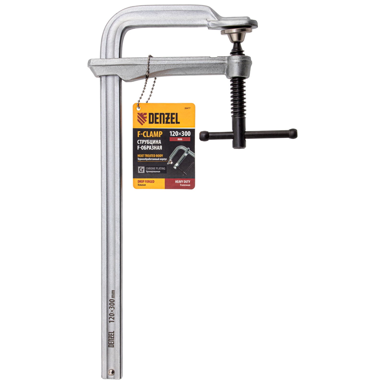 Кованая F-образная струбцина Denzel 20477 с глубиной зажима 120 мм, усиленная, предназначена для фиксации деталей шириной до 300 мм и материалов при проведении слесарных, столярных и сварочных работ. Тавровый профиль обеспечивает устойчивость конструкции к изгибу, что позволяет фиксировать детали со значительным усилием. Струбцина подходит для профессионального применения.