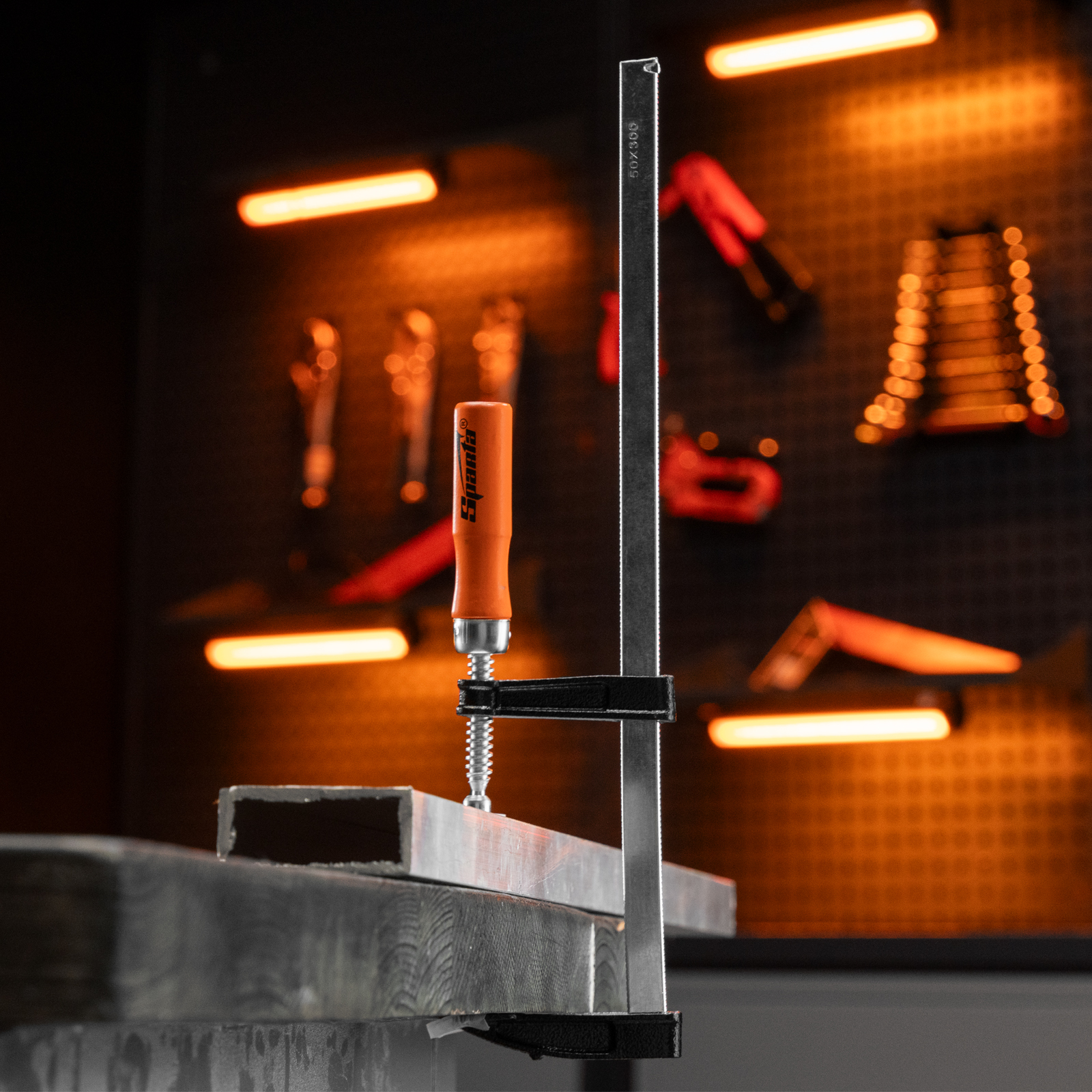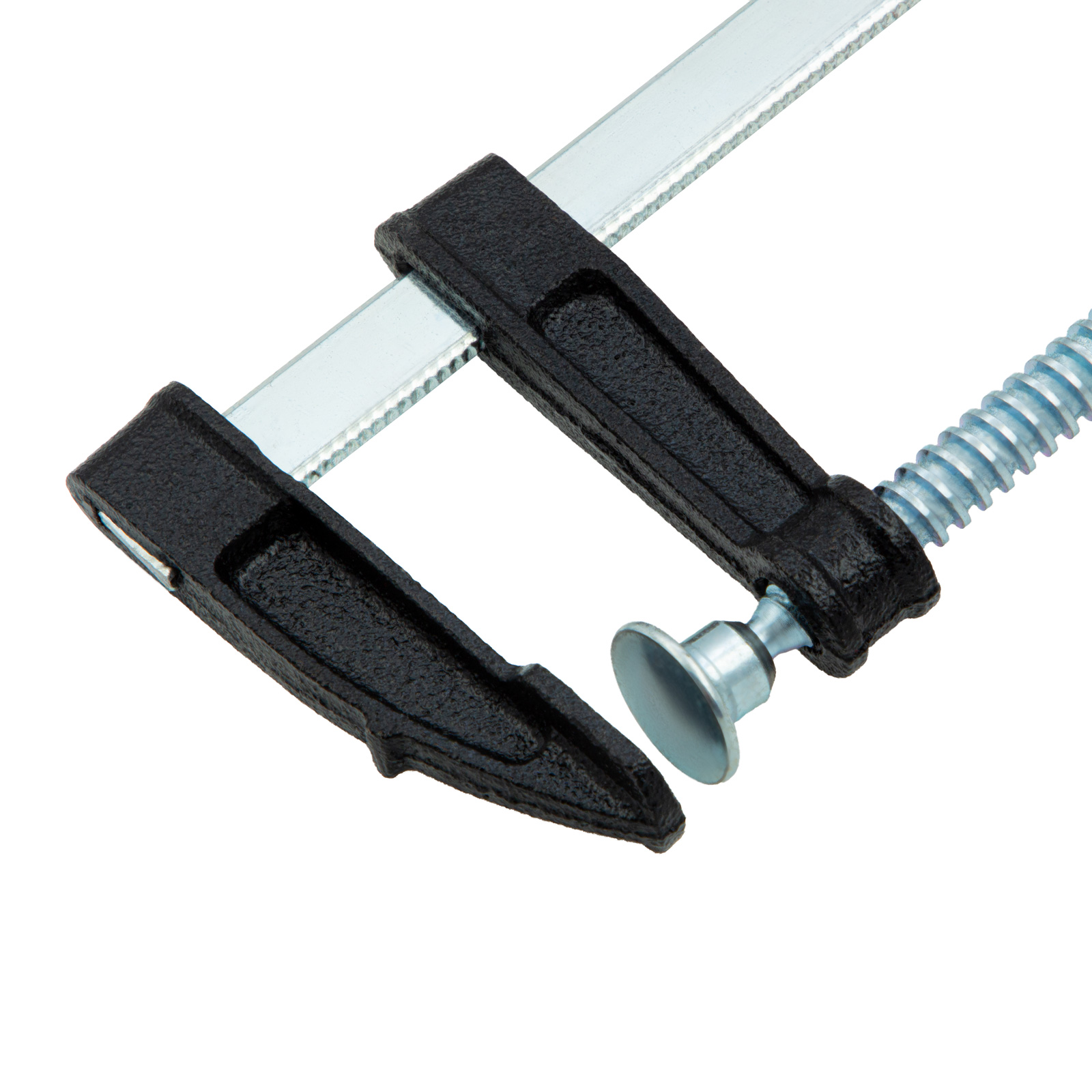 F-образная струбцина Sparta 204325 длиной 350 мм и величиной зажима 300 х 50 мм позволяет фиксировать заготовки из металла, древесины и других материалов для их соединения или обработки. Используется в столярном и слесарном деле. Деталь помещают между губками, одна из которых подвижна и служит для регулировки величины захвата. Винтовой зажим позволяет фиксировать заготовку со значительным усилием. Элементы конструкции выдерживают высокую температуру, поэтому струбцина подходит для проведения сварочных работ, при этом пластиковые накладки необходимо снять.