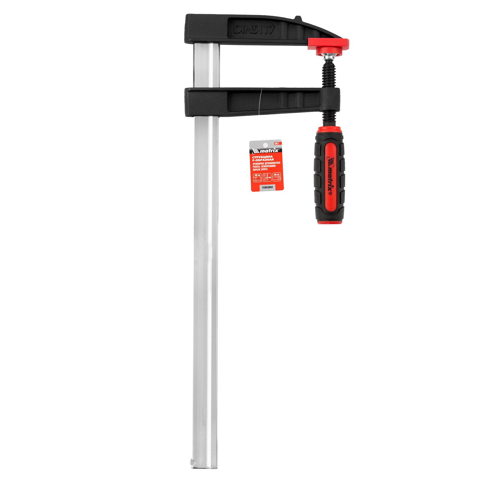 Усиленная F-образная струбцина Matrix 20411 размером 400 х 120 х 500 мм используется для зажима металлических, деревянных и других заготовок для их последующей обработки или сборки. Представляет собой штангу, на которой установлены 2 кронштейна — неподвижный и подвижный. Деталь помещается между ними и прижимается к губкам при помощи винтового зажима с трапециевидной резьбой. Величина захвата регулируется при помощи подвижного кронштейна и может достигать 400 мм. Струбцину используют для проведения слесарных и столярных работ. Металлическая конструкция выдерживает высокую температуру, поэтому инструмент пригодится для выполнения сварочных работ (перед началом необходимо снять пластиковые накладки с губок).