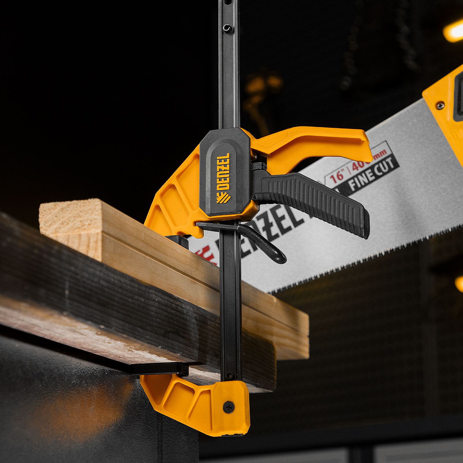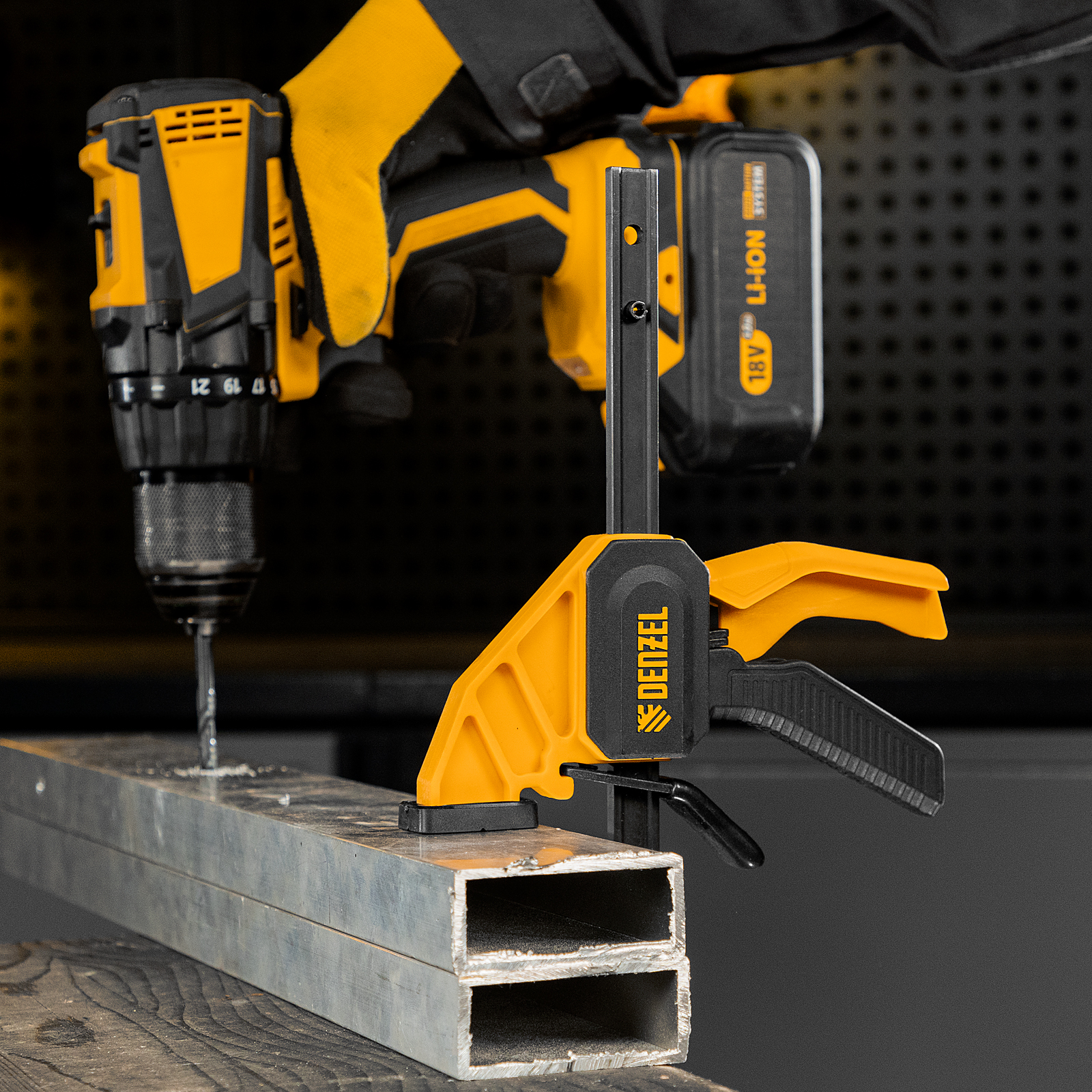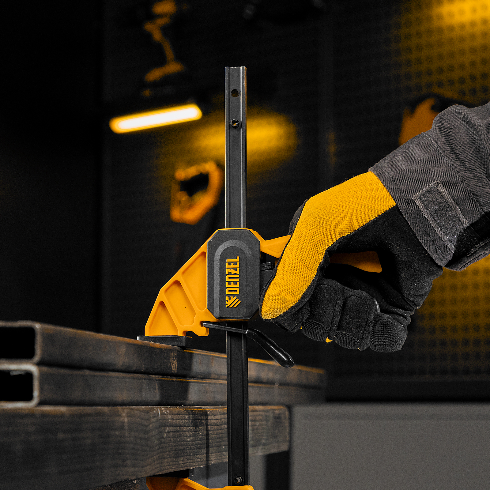 - Комфортное использование — струбцина весит всего 290 г, обрезиненная кнопка фиксации обеспечивает удобный захват.